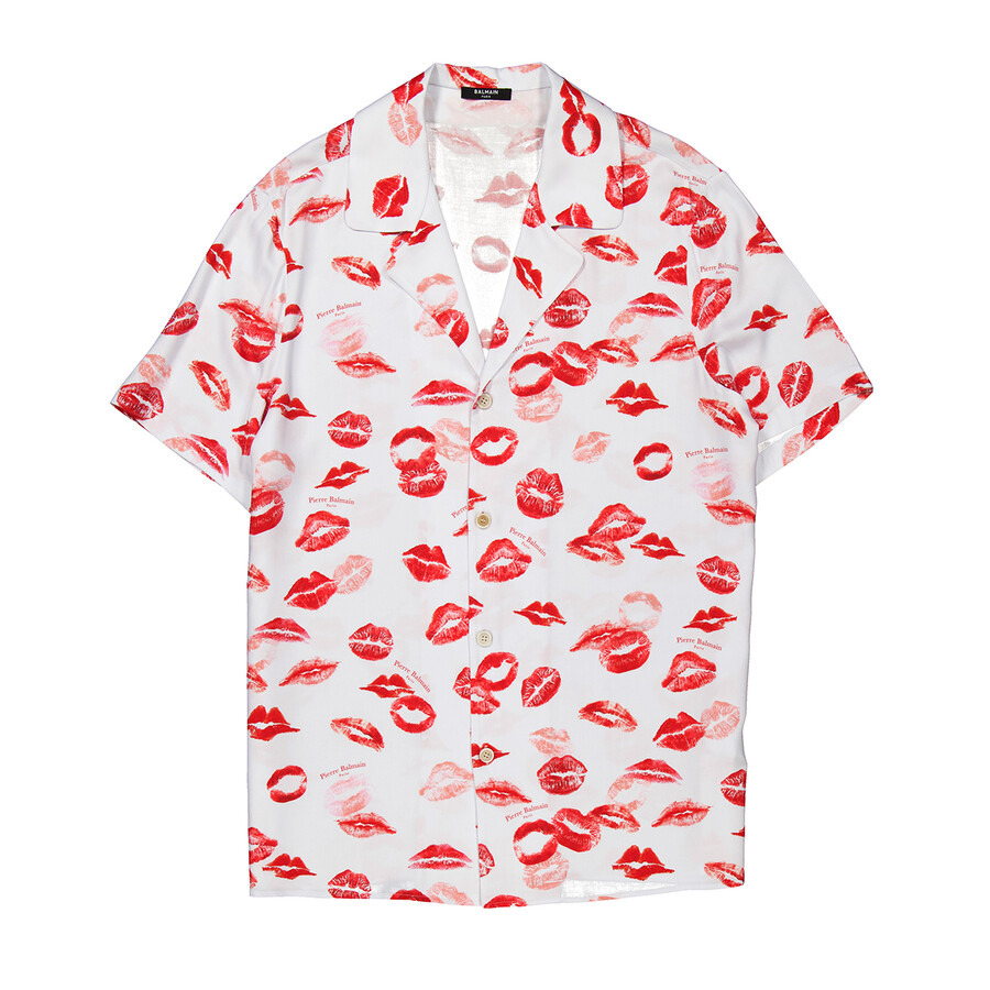 Balmain Men's Tops. Fashion category: Shirts & Blouses. SKU: DH0HN067VG53- BLANC/ROUGE VIF. Color: Blanc/Rouge Vif. Balmain Twill Pyjama Shirt With Kiss Print. Made from fluid viscose twill, this shirt features a relaxed fit, shirt collar, short sleeves, and fastens with four engraved buttons. It is adorned with the Pierre Balmain signature integrated into the print and finished with an all-over kiss print. 100% viscose. Made in Italy. GENERAL Brand Type: Designer Color: Blanc/Rouge Vif INFORMATION Brand: Balmain Gender: Mens Model: DH0HN067VG53- BLANC/ROUGE VIF DETAILS Category: Tops Apparel Type: Shirts & Blouses Material: Viscose ADDITIONAL INFO Jomashop Sku: -67VG53BLANCROUGEVIF Department: Clothing