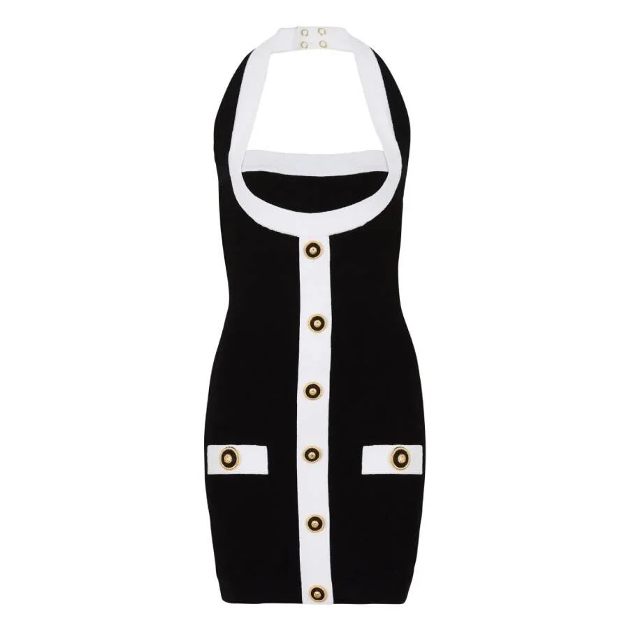 Balmain Ladies Dresses. SKU: EF1R2390KH99. Color: Black/White. Balmain Two-Tone Halterneck Mini Dress. Elevate your eveningwear with this Balmain halterneck mini dress, crafted from soft viscose knit. Featuring a square neckline, wide halter strap, and two-tone metal lion thread chain buttons, this dress exudes the house’s signature blend of elegance and edge. Finished with a back zip closure and neck snap buttons with gold-tone details, it’s designed for a striking, polished silhouette. Composition: Viscose 85%, Polyester 15%. Made in France. GENERAL Brand Type: Designer Color: Black/White INFORMATION Brand: Balmain Gender: Womens Model: EF1R2390KH99-NOIR/BLANC DETAILS Category: Dresses ADDITIONAL INFO Jomashop Sku: -1R2390KH99NOIRBLANC Department: Clothing