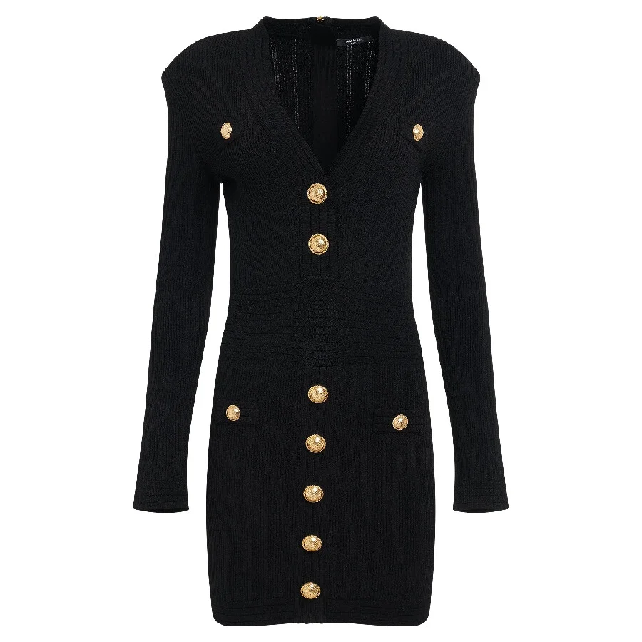 Balmain Ladies Dresses. Fashion category: Casual Dresses. SKU: YF1R8060KB00-0PA. Color: Black. Balmain V Neck Button Embellished Dress. This dress features a V-neckline, fine ribbed texture, embossed gold-tone buttons, a straight hem, shoulder pads, long sleeves, and a rear zip fastening. 83% Viscose 17% Polyester. Made in Italy. GENERAL Brand Type: Designer Color: Black INFORMATION Brand: Balmain Gender: Womens Model: YF1R8060KB00-0PA DETAILS Category: Dresses Apparel Type: Casual Dresses Material: Polyester, Viscose ADDITIONAL INFO Jomashop Sku: -YF1R8060KB000PA Department: Clothing