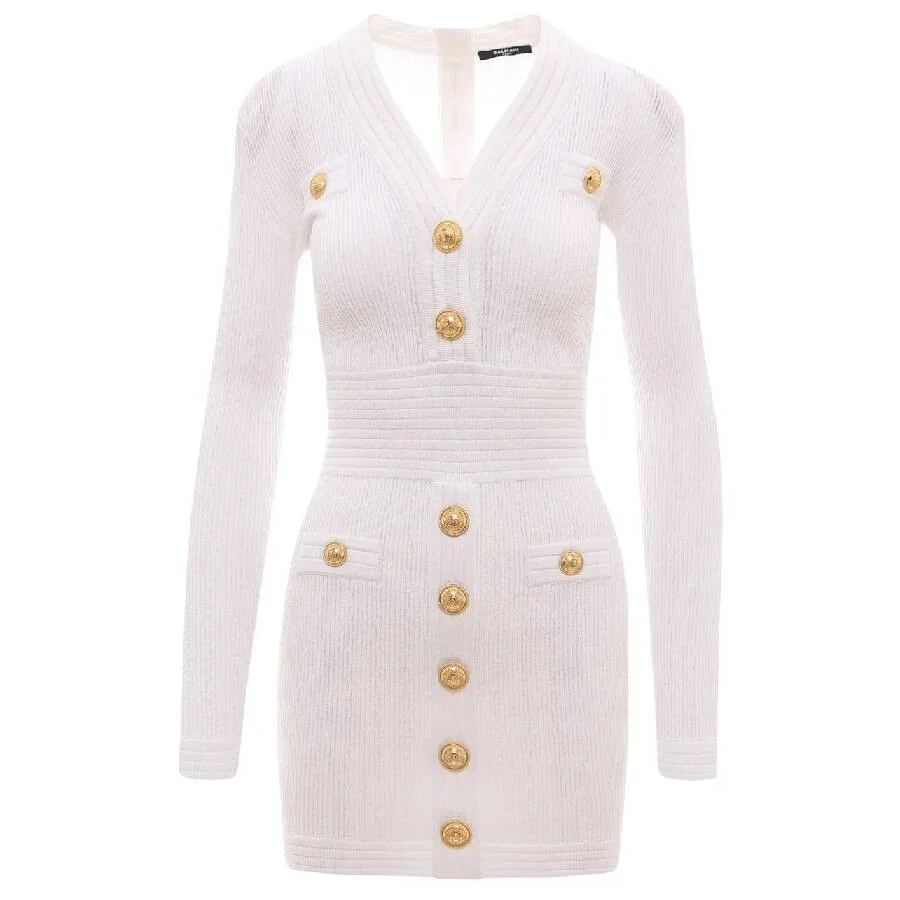 Balmain Ladies Dresses. Fashion category: Casual Dresses. SKU: WF1R8060K211-0FA. Color: White. Balmain V Neck Knitted Dress. This dress features long sleeves, a V-neck design, embossed gold-tone button details, and a back zip fastening. 83% Viscose, 17% Polyester. Made in Italy. GENERAL Size Info: 6 Brand Type: Designer Clothing Size: Ladies Apparel Size: 6 Color: White INFORMATION Brand: Balmain Gender: Womens Model: WF1R8060K211-0FA DETAILS Category: Dresses Apparel Type: Casual Dresses Material: Polyester, Viscose ADDITIONAL INFO UPC Code: 3615881751063 Jomashop Sku: Z-KMD3N Department: Clothing