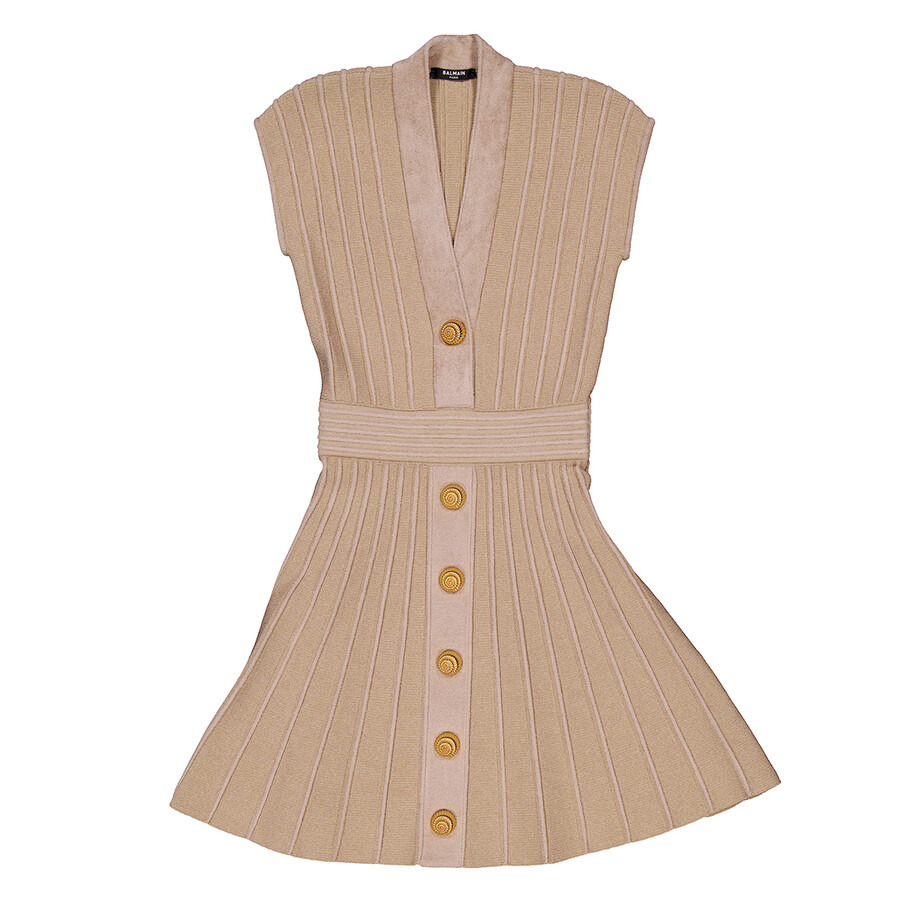 Balmain Ladies Dresses. Fashion category: Casual Dresses. SKU: DF0R7086KH64-BEIGE. Color: Beige. Balmain V-Neck Ribbed Mini Dress. This mini dress features a wide ribbed design, front press-stud fastening, decorative button detailing, a ribbed V-neck, short sleeves, a fitted waistline, an unlined construction, a flared hem, and a thigh-length cut. 79% Viscose, 13% Polyester, 8% Polyamide. Made in France. GENERAL Color: Beige INFORMATION Brand: Balmain Gender: Womens Model: DF0R7086KH64-BEIGE DETAILS Category: Dresses Apparel Type: Casual Dresses Material: Polyamide, Polyester, Viscose ADDITIONAL INFO Jomashop Sku: -DF0R7086KH64BEIGE Department: Clothing