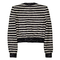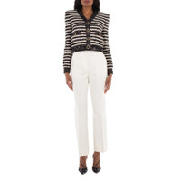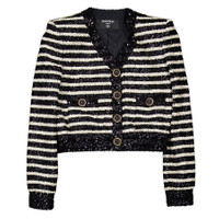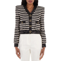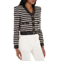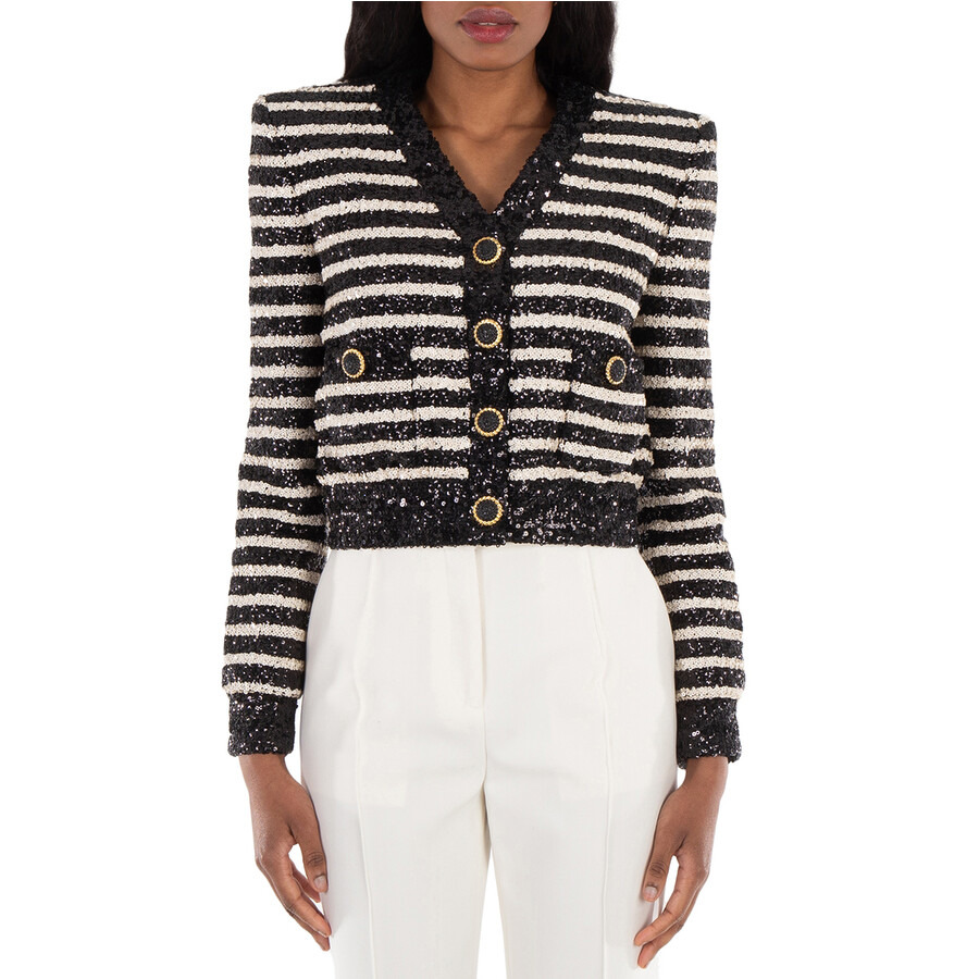 Balmain Ladies Outerwear. Fashion category: Coats & Jackets. SKU: DF1KL180XJ31-NOIR/BLANC. Color: Noir/Blanc. Balmain V-Neck Striped Sequinned Jacket. This cropped jacket features sequin embellishment with a horizontal stripe pattern, a V-neck, shoulder pads, long sleeves, two side welt pockets, front press-stud fastening, and a straight hem. 100% Polyester. GENERAL Color: Noir/Blanc INFORMATION Brand: Balmain Gender: Womens Model: DF1KL180XJ31-NOIR/BLANC DETAILS Category: Outerwear Apparel Type: Coats & Jackets Material: Polyester ADDITIONAL INFO Jomashop Sku: -1KL180XJ31NOIRBLANC Department: Clothing
