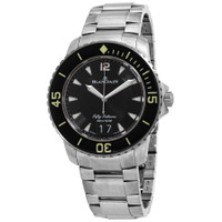 Grey titanium case with a grey titanium bracelet. Uni-directional rotating grey titanium bezel with a black sapphire ring. Black dial with luminous silver-tone hands and index hour markers. Minute markers around the outer rim. Dial Type: Analog. Luminescent hands and markers. Date display at the 3 o'clock position. Blancpain calibre 6918B automatic movement, containing 44 Jewels, bitting at 28800 vph, and has a power reserve of approximately 120 hours. Scratch resistant sapphire crystal. Screw down crown. Transparent case back. Round case shape. Case size: 45 mm. Case thickness: 16.2 mm. Band width: 23 mm. Fold over clasp. Water resistant at 300 meters / 1000 feet. Functions: date, hour, minute, second. Fifty Fathoms Series. Luxury watch style. Watch label: Swiss Made. Blancpain Fifty Fathoms Automatic Black Dial Men's Watch 5050 12B30 98B. GENERAL Box Type: Original Box CASE Case Size: 45 Case Thickness: 16.2 mm Case Material: Titanium Case Shape: Round Case Back: Transparent BAND Band Material: Titanium Band Type: Bracelet Band Color: Grey 1 Band Width: 23 mm Clasp: Fold Over DIAL Dial Color: Black Type: Analog Crystal: Scratch Resistant Sapphire Hands: Luminous Silver-tone Dial Markers: Index Second Markers: Minute Markers around the outer rim Luminiscence: Hands and Markers Bezel: Uni-directional Rotating Bezel Color: Grey Bezel Material: Titanium with a Black Sapphire Ring Crown: Screw Down INFORMATION Brand: Blancpain Series: Fifty Fathoms Collection Name: Fifty Fathoms Gender: Mens Model: 5050 12B30 98B Watch Label: Swiss Made Movement: Automatic Engine: Blancpain Calibre 6918B FEATURES Water Resistance: 300 meters / 1000 feet Calendar: Date display at the 3 o'clock position Functions: Date, Hour, Minute, Second Watch Features: Analog, Titanium ADDITIONAL INFO Watch Style: Luxury Warranty: 2 Year Jomashop Warranty Jomashop Sku: BLANC5050-12B30-98B Item Variation: N05050O12B030N098B Department: Watches Category: Watches