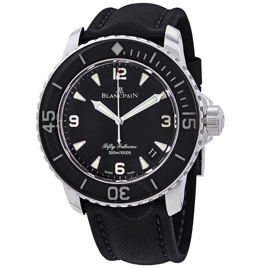 Stainless steel case with a black sail canvas strap. Uni-directional rotating coin edge stainless steel bezel with a black (sapphire coated) top ring. Black dial with luminous silver-tone hands and index hour markers. Arabic numerals mark the 3, 6, 9, and 12 o'clock positions. Minute markers around the outer rim. Dial Type: Analog. Luminescent hands and markers. Date display between the 4 and 5 o'clock positions. Blancpain calibre 1315 automatic movement, containing 35 Jewels, composed of 227 parts, and has a power reserve of approximately 120 hours. Scratch resistant sapphire crystal. Screw down crown. Solid case back. Round case shape. Case size: 45 mm. Case thickness: 15.5 mm. Band width: 23 mm. Tang clasp. Water resistant at 300 meters / 1000 feet. Functions: date, hour, minute, second. Fifty Fathoms Automatique Series. Luxury watch style. Watch label: Swiss Made. Blancpain Fifty Fathoms Automatique Black Dial Men's Watch 5015-1130-52A. GENERAL Box Type: Original Box CASE Case Size: 45 Case Thickness: 15.5 mm Case Material: Stainless Steel Case Shape: Round Case Back: Solid BAND Band Material: Sail Canvas Band Type: Strap Band Color: Black Band Width: 23 mm Clasp: Tang DIAL Dial Color: Black Type: Analog Crystal: Scratch Resistant Sapphire Hands: Luminous Silver-tone Dial Markers: Index Second Markers: Arabic numerals mark the 3, 6, 9, and 12 o'clock positions. Minute Markers around the outer rim Luminiscence: Hands and Markers Bezel: Uni-directional Rotating Coin Edge Bezel Color: Silver-tone Bezel Material: Stainless Steel with a Black (Sapphire Coated) Top Ring Crown: Screw Down INFORMATION Brand: Blancpain Series: Fifty Fathoms Automatique Collection Name: Fifty Fathoms Automatique Gender: Mens Model: 5015-1130-52A Watch Label: Swiss Made Movement: Automatic Engine: Blancpain Calibre 1315 Power Reserve: 120 hours FEATURES Water Resistance: 300 meters / 1000 feet Calendar: Date display between the 4 and 5 o'clock positions Functions: Date, Hour, Minute, Second Watch Features: Analog, Stainless Steel ADDITIONAL INFO Watch Style: Luxury Warranty: 2 Year Jomashop Warranty UPC Code: 7613297301274 Additional Info: N05015O011030N052A Jomashop Sku: BLANC5015-1130-52A Department: Watches Category: Watches