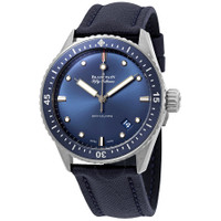 Grey ceramic case with a blue sail canvas strap. Uni-directional rotating coin edge grey ceramic bezel with a blue ceramic (count-up elapsed time) ring. Blue dial with luminous grey hands and dot hour markers. Minute markers around the outer rim. Dial Type: Analog. Luminescent hands and markers. Date display between the 4 and 5 o'clock positions. Blancpain calibre 1315 automatic movement, containing 35 Jewels, composed of 227 parts, and has a power reserve of approximately 120 hours. Scratch resistant sapphire crystal. Screw down crown. Transparent case back. Round case shape. Case size: 43.6 mm. Case thickness: 13.83 mm. Band width: 23 mm. Tang clasp. Water resistant at 300 meters / 1000 feet. Functions: date, hour, minute, second. Fifty Fathoms Bathyscaphe Series. Dive watch style. Watch label: Swiss Made. Blancpain Fifty Fathoms Bathyscaphe Automatic Blue Dial Men's Watch 5000-0240-O52A. INFORMATION Brand: Blancpain Series: Fifty Fathoms Bathyscaphe Collection Name: Fifty Fathoms Bathyscaphe Gender: Mens Model: 5000-0240-O52A Watch Label: Swiss Made Movement: Automatic Engine: Blancpain Calibre 1315 Power Reserve: 120 hours CASE Case Size: 43.6 mm Case Thickness: 13.83 mm Case Material: Ceramic Case Shape: Round Case Back: Transparent BAND Band Material: Sail Canvas Band Type: Strap Band Color: Blue Band Width: 23 mm Clasp: Tang DIAL Dial Color: Blue Type: Analog Crystal: Scratch Resistant Sapphire Hands: Luminous Grey Dial Markers: Dot Second Markers: Minute Markers around the outer rim Luminiscence: Hands and Markers Bezel: Uni-directional Rotating Coin Edge Bezel Color: Grey Bezel Material: Ceramic with a Blue Ceramic (Count-Up Elapsed Time) Ring Crown: Screw Down FEATURES Water Resistance: 300 meters / 1000 feet Calendar: Date display between the 4 and 5 o'clock positions Functions: Date, Hour, Minute, Second Watch Features: Ceramic, Analog ADDITIONAL INFO Watch Style: Dive Warranty: 2 Year Jomashop Warranty UPC Code: 7613297518030 Additional Info: N05000O002040NO52A Jomashop Sku: BLANC5000-0240-O52A Department: Watches Category: Watches
