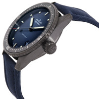Black ceramic case with a blue canvas strap. Uni-directional rotating black ceramic bezel. Blue dial with black hands and index hour markers. Minute markers around the outer rim. Dial Type: Analog. Luminescent hands and markers. Date display between 4 and 5 o'clock position. Blancpain Calibre 1315 Automatic movement, containing 35 Jewels, composed of 227 parts, and has a power reserve of approximately 120 hours. Scratch resistant sapphire crystal. Screw down crown. Transparent see through case back. Round case shape, case size: 43 mm. Buckle clasp. Water resistant at 300 meters / 1000 feet. Functions: date, hour, minute, second. Fifty Fathoms Bathyscaphe Series. Dive watch style. Watch label: Swiss Made. Blancpain Fifty Fathoms Bathyscaphe Automatic Blue Dial Men's Watch 5000A 014 0O52A. GENERAL Box Type: Original Box CASE Case Diameter: 43 mm Case Material: Ceramic Case Shape: Round Case Back: Transparent See Through BAND Band Material: Canvas Band Type: Strap Band Color: Blue Clasp: Buckle DIAL Dial Color: Blue Type: Analog Crystal: Scratch Resistant Sapphire Hands: Black Dial Markers: Index Second Markers: Minute Markers around the outer rim Luminiscence: Hands and Markers Bezel: Uni-directional Rotating Bezel Color: Black Bezel Material: Ceramic Crown: Screw Down INFORMATION Brand: Blancpain Series: Fifty Fathoms Bathyscaphe Collection Name: Fifty Fathoms Bathyscaphe Gender: Mens Model: 5000A 014 0O52A Watch Label: Swiss Made Movement: Automatic Engine: Blancpain Calibre 1315 Power Reserve: 120 hours FEATURES Water Resistance: 300 meters / 1000 feet Calendar: Date display between 4 and 5 o'clock position Functions: Date, Hour, Minute, Second Watch Features: Ceramic, Analog ADDITIONAL INFO Watch Style: Dive Warranty: 2 Year Jomashop Warranty Jomashop Sku: BLANC5000A0140O52A Department: Watches