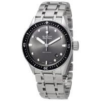 Silver-tone stainless steel case with a silver-tone stainless steel bracelet. Uni-directional rotating coin edge black count-up elapsed time ceramic bezel. Meteor grey dial with silver-tone hands and index hour markers. Minute markers around the outer rim. Dial Type: Analog. Luminescent hands and markers. Date display between 4 and 5 o'clock position. Blancpain Calibre 1315 Automatic movement, containing 35 Jewels, composed of 227 parts, and has a power reserve of approximately 120 hours. Scratch resistant sapphire crystal. Screw down crown. Transparent case back. Round case shape, case size: 43 mm, case thickness: 13.4 mm. Tang clasp. Water resistant at 300 meters / 1000 feet. Functions: date, hour, minute, second. Fifty Fathoms Bathyscaphe Series. Dive watch style. Watch label: Swiss Made. Blancpain Fifty Fathoms Bathyscaphe Meteor Grey Dial Automatic Men's Watch 5000-1110-70B. GENERAL Box Type: Original Box CASE Case Size: 43 Case Thickness: 13.4 mm Case Material: Stainless Steel Case Shape: Round Case Back: Transparent BAND Band Material: Stainless Steel Band Type: Bracelet Band Color: Silver-tone Clasp: Tang DIAL Dial Color: Meteor Grey Type: Analog Crystal: Scratch Resistant Sapphire Hands: Silver-tone Dial Markers: Index Second Markers: Minute Markers around the outer rim Luminiscence: Hands and Markers Bezel: Uni-directional Rotating Coin Edge Bezel Color: Black Count-Up Elapsed Time Bezel Material: Ceramic Crown: Screw Down INFORMATION Brand: Blancpain Series: Fifty Fathoms Bathyscaphe Collection Name: Fifty Fathoms Bathyscaphe Gender: Mens Model: 5000-1110-70B Watch Label: Swiss Made Movement: Automatic Engine: Blancpain Calibre 1315 Power Reserve: 120 hours FEATURES Water Resistance: 300 meters / 1000 feet Calendar: Date display between 4 and 5 o'clock position Functions: Date, Hour, Minute, Second Watch Features: Analog, Ceramic, Stainless Steel ADDITIONAL INFO Watch Style: Dive Warranty: 2 Year Jomashop Warranty Jomashop Sku: BLANC5000-1110-70B Department: Watches Category: Watches