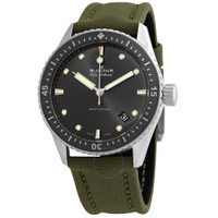 Stainless steel case with a green sail canvas strap. Uni-directional rotating stainless steel bezel with a black ceramic (count-up elapsed time) ring. Meteor grey dial with luminous grey hands and dot hour markers. Minute markers around the outer rim. Dial Type: Analog. Luminescent hands and markers. Date display between the 4 and 5 o'clock positions. Blancpain calibre 1315 automatic movement, containing 35 Jewels, composed of 227 parts, and has a power reserve of approximately 120 hours. Scratch resistant sapphire crystal. Screw down crown. Transparent case back. Round case shape. Case size: 43 mm. Case thickness: 13.4 mm. Band width: 23 mm. Tang clasp. Water resistant at 300 meters / 1000 feet. Functions: date, hour, minute, second. Fifty Fathoms Bathyscaphe Series. Dive watch style. Watch label: Swiss Made. Blancpain Fifty Fathoms Bathyscaphe Meteor Grey Dial Automatic Men's Watch 5000-1110-K52A. GENERAL Box Type: Original Box CASE Case Size: 43 Case Thickness: 13.4 mm Case Material: Stainless Steel Case Shape: Round Case Back: Transparent BAND Band Material: Sail Canvas Band Type: Strap Band Color: Green Band Width: 23 mm Clasp: Tang DIAL Dial Color: Meteor Grey Type: Analog Crystal: Scratch Resistant Sapphire Hands: Luminous Grey Dial Markers: Dot Second Markers: Minute Markers around the outer rim Luminiscence: Hands and Markers Bezel: Uni-directional Rotating Bezel Color: Silver-tone Bezel Material: Stainless Steel with a Black Ceramic (Count-Up Elapsed Time) Ring Crown: Screw Down INFORMATION Brand: Blancpain Series: Fifty Fathoms Bathyscaphe Collection Name: Fifty Fathoms Bathyscaphe Gender: Mens Model: 5000-1110-K52A Watch Label: Swiss Made Movement: Automatic Engine: Blancpain Calibre 1315 Power Reserve: 120 hours FEATURES Water Resistance: 300 meters / 1000 feet Calendar: Date display between the 4 and 5 o'clock positions Functions: Date, Hour, Minute, Second Watch Features: Analog, Ceramic, Stainless Steel ADDITIONAL INFO Watch Style: Dive Warranty: 2 Year Jomashop Warranty Additional Info: N05000O011010NK52A Jomashop Sku: BLANC5000-1110-K52A Department: Watches Category: Watches