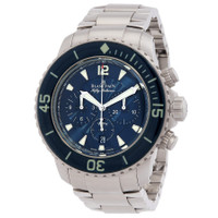Silver-tone stainless steel case with a silver-tone stainless steel bracelet. Uni-directional rotating blue stainless steel bezel. Blue flinque dial with silver-tone hands and index- Arabic at the 12 o' clock hour markers. Minute markers around the outer rim. Dial Type: Analog. Luminescent hands and markers. Date display at the 6 o'clock position. Chronograph - three sub-dials displaying: 60 seconds, 30 minutes, and 12 hours. Blancpain Calibre F185 Automatic movement, based upon Frederic Piguet 1185, containing 37 Jewels, composed of 308 parts, bitting at 21600 vph, and has a power reserve of approximately 40 hours. Scratch resistant sapphire crystal. Screw down crown. Solid case back. Round case shape, case size: 45 mm, case thickness: 15.5 mm. Band width: 23 mm. Water resistant at 30 meters / 100 feet. Functions: chronograph, column wheel, flyback, date, hour, minute, small second. Fifty Fathoms Series. Luxury watch style. Watch label: Swiss Made. Blancpain Fifty Fathoms Chronograph Automatic Men's Watch 5085FB-1140-71B. CASE Case Size: 45 Case Thickness: 15.5 mm Case Material: Stainless Steel Case Shape: Round Case Back: Solid BAND Band Material: Stainless Steel Band Type: Bracelet Band Color: Silver-tone Band Width: 23 mm Clasp: Deployment with Push Button Release DIAL Dial Color: Blue Flinque Type: Analog Crystal: Scratch Resistant Sapphire Hands: Silver-tone Dial Markers: Index- Arabic at the 12 o' clock Second Markers: Minute Markers around the outer rim Sub Dials: Three - 60 Second, 30 Minute and 12 Hour Luminiscence: Hands and Markers Bezel: Uni-directional Rotating Bezel Color: Blue Bezel Material: Stainless Steel Crown: Screw Down INFORMATION Brand: Blancpain Series: Fifty Fathoms Collection Name: Fifty Fathoms Gender: Mens Model: 5085FB-1140-71B Watch Label: Swiss Made Movement: Automatic Engine: Blancpain Calibre F185 Power Reserve: 40 hours FEATURES Water Resistance: 30 meters / 100 feet Calendar: Date display at the 6 o'clock position Functions: Chronograph, Column Wheel, FlyBack, Date, Hour, Minute, Small Second Watch Features: Analog, Flyback, Stainless Steel, Chronograph ADDITIONAL INFO Watch Style: Luxury Warranty: 2 Year Jomashop Warranty Jomashop Sku: BLANC5085FB-1140-71B Department: Watches Category: Watches