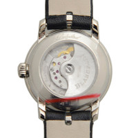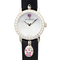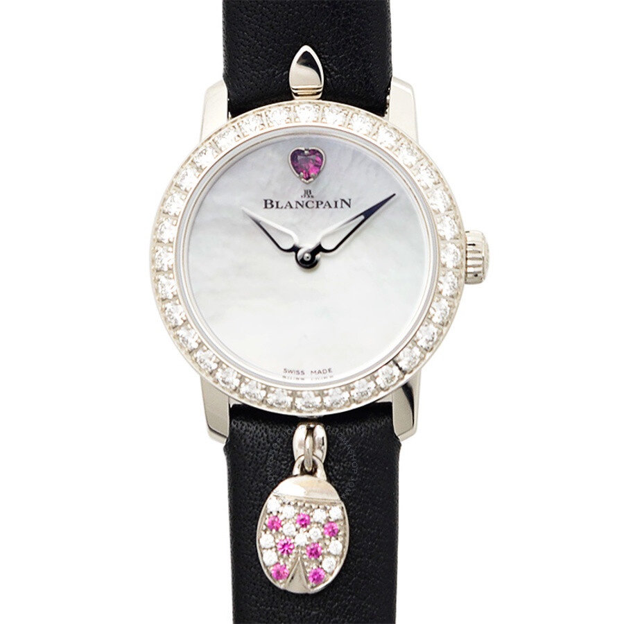 18kt white gold case with a black leather strap. Fixed 18kt white gold bezel with diamond set. Mother of pearl dial with silver-tone hands. Dial Type: Analog. Blancpain Calibre 615 Automatic movement, containing 29 Jewels, composed of 180 parts, bitting at 21600 vph, and has a power reserve of approximately 38 hours. Scratch resistant sapphire crystal. Pull / push crown. Round case shape, case size: 21.50 mm, case thickness: 8.23 mm. Band width: 11 mm. Buckle clasp. Water resistant at 30 meters / 100 feet. Functions: hour, minute. Additional Info: 0.57 carat (s). Ladybird Slim Series. Luxury watch style. Watch label: Swiss Made. Blancpain Ladybird Slim Automatic Ladies Watch 0063D-1954-63A. INFORMATION Brand: Blancpain Series: Ladybird Slim Collection Name: Ladybird Slim Gender: Womens Model: 0063D-1954-63A Watch Label: Swiss Made Movement: Automatic Engine: Blancpain Calibre 615 Power Reserve: 40 hours CASE Case Size: 21.50 mm Case Thickness: 8.23 mm Case Material: 18kt White Gold Case Shape: Round BAND Band Material: Leather Band Type: Strap Band Color: Black Band Width: 11 mm Clasp: Buckle DIAL Dial Color: Mother Of Pearl Type: Analog Crystal: Scratch Resistant Sapphire Hands: Silver-tone Bezel: Fixed Bezel Color: 18kt White Gold Bezel Material: Diamond Set Crown: Pull / Push FEATURES Water Resistance: 30 meters / 100 feet Functions: Hour, Minute Watch Features: Diamond, Leather, Gold, Analog ADDITIONAL INFO Watch Style: Luxury Warranty: 2 Year Jomashop Warranty Additional Info: 0.57 carat (s) Jomashop Sku: BLANC0063D-1954-63A Item Variation: N00063D019054N063A Department: Watches Category: Watches