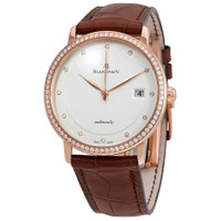 18kt rose gold case with a brown alligator leather strap. Fixed 18kt rose gold bezel with diamond set. Opaline dial with rose gold-tone leaf-style shape hands and diamonds hour markers. Dial Type: Analog. Date display at the 3 o'clock position. Blancpain Calibre 1150 Automatic movement, containing 28 Jewels, composed of 210 parts, bitting at 21600 vph, and has a power reserve of approximately 100 hours. Scratch resistant sapphire crystal. Pull / push crown. Solid case back. Round case shape, case size: 37.60 mm, case thickness: 9.15 mm. Band width: 20 mm. Pin buckle clasp. Water resistant at 30 meters / 100 feet. Functions: date, hour, minute, second. Ultraplate Series. Luxury watch style. Watch label: Swiss Made. Blancpain Ultraplate Automatic Men's Watch 6223-2987-55B. CASE Case Size: 37 Case Thickness: 9.15 mm Case Material: 18kt Rose Gold Case Shape: Round Case Back: Solid BAND Band Material: Alligator Leather Band Type: Strap Band Color: Brown Band Width: 20 mm Clasp: Pin Buckle DIAL Dial Color: Opaline Type: Analog Crystal: Scratch Resistant Sapphire Hands: Rose Gold-tone Leaf-style shape Dial Markers: Diamonds Bezel: Fixed Bezel Color: 18kt Rose Gold Bezel Material: Diamond Set Crown: Pull / Push INFORMATION Brand: Blancpain Series: Ultraplate Collection Name: Ultraplate Gender: Mens Model: 6223-2987-55B Watch Label: Swiss Made Movement: Automatic Engine: Blancpain Calibre 1150 Power Reserve: 100 hours FEATURES Water Resistance: 30 meters / 100 feet Calendar: Date display at the 3 o'clock position Functions: GMT, Second Time Zone, Hour, Minute, Second Watch Features: Alligator Leather, Analog, GMT, Gold, Leather, Diamond, Time Zone ADDITIONAL INFO Watch Style: Luxury Warranty: 2 Year Jomashop Warranty Jomashop Sku: BLANC6223-2987-55B Department: Watches Category: Watches