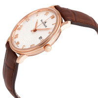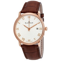 18kt rose gold case with a brown alligator leather strap. Fixed 18kt rose gold bezel. Opaline dial with rose gold-tone hands and Roman numeral hour markers. Dial Type: Analog. Date display at the 3 o'clock position. Blancpain Calibre 1150 Automatic movement, containing 28 Jewels, composed of 210 parts, bitting at 21600 vph, and has a power reserve of approximately 100 hours. Scratch resistant sapphire crystal. Pull / push crown. Skeleton transparent exhibition see through case back. Round case shape, case size: 40 mm, case thickness: 9.08 mm. Band width: 22 mm. Pin buckle clasp. Water resistant at 30 meters / 100 feet. Functions: date, hour, minute, second. Villeret Series. Luxury watch style. Watch label: Swiss Made. Blancpain Villeret Automatic Men's Watch 6651C-3642-55A. CASE Case Size: 40 Case Thickness: 9.08 mm Case Material: 18kt Rose Gold Case Shape: Round Case Back: Skeleton Transparent Exhibition See Through BAND Band Material: Alligator Leather Band Type: Strap Band Color: Brown Band Width: 22 mm Clasp: Pin Buckle DIAL Dial Color: Opaline Type: Analog Crystal: Scratch Resistant Sapphire Hands: Rose Gold-tone Dial Markers: Roman Numeral Bezel: Fixed Bezel Material: 18kt Rose Gold Crown: Pull / Push INFORMATION Brand: Blancpain Series: Villeret Collection Name: Villeret Gender: Mens Model: 6651C-3642-55A Watch Label: Swiss Made Movement: Automatic Engine: Blancpain Calibre 1150 Power Reserve: 100 hours FEATURES Water Resistance: 30 meters / 100 feet Calendar: Date display at the 3 o'clock position Functions: Date, Hour, Minute, Second Watch Features: Alligator Leather, Analog, Gold, Leather ADDITIONAL INFO Watch Style: Luxury Warranty: 2 Year Jomashop Warranty Jomashop Sku: BLANC6651C-3642-55A Department: Watches Category: Watches