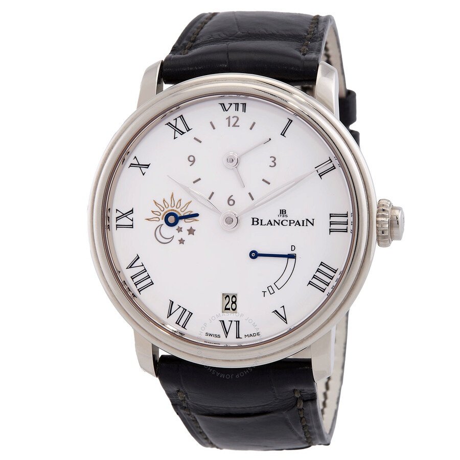 18kt white gold case with a black alligator leather strap. Fixed 18kt white gold bezel. White dial with silver-tone hands and Roman numeral hour markers. Dial Type: Analog. Date display at the 6 o'clock position. Three sub-dials displaying: 12 hour / 60 ninute, day/night indicator and power reserve indicator. Blancpain Calibre 5235DF Automatic movement, containing 36 Jewels, composed of 324 parts, and has a power reserve of approximately 192 hours. Scratch resistant sapphire crystal. Skeleton transparent exhibition see through case back. Round case shape, case size: 42 mm, case thickness: 13.65 mm. Band width: 23 mm. Water resistant at 30 meters / 100 feet. Functions: date, hour, minute, second, power reserve, and day and night indication. Villeret Series. Luxury watch style. Watch label: Swiss Made. Blancpain Villeret Automatic Men's Watch 6661-1531-55B. CASE Case Size: 42 Case Thickness: 13.65 mm Case Material: 18kt White Gold Case Shape: Round Case Back: Skeleton Transparent Exhibition See Through BAND Band Material: Alligator Leather Band Type: Strap Band Color: Black Band Width: 23 mm DIAL Dial Color: White Type: Analog Crystal: Scratch Resistant Sapphire Hands: Silver-tone Dial Markers: Roman Numeral Sub Dials: Three - 12 Hour / 60 Ninute, Day/Night Indicator and Power Reserve Indicator Bezel: Fixed Bezel Material: 18kt White Gold INFORMATION Brand: Blancpain Series: Villeret Collection Name: Villeret Gender: Mens Model: 6661-1531-55B Watch Label: Swiss Made Movement: Automatic Engine: Blancpain Calibre 5235DF Power Reserve: 192 hours FEATURES Water Resistance: 30 meters / 100 feet Calendar: Date display at the 6 o'clock position Functions: Date, Hour, Minute, Second, Power Reserve, and Day and Night Indication Watch Features: Leather, Gold, Alligator Leather, Analog, Power Reserve Indicator, Day/Night Indicator ADDITIONAL INFO Watch Style: Luxury Warranty: 2 Year Jomashop Warranty Jomashop Sku: BLANC6661-1531-55B Department: Watches Category: Watches