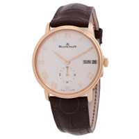 18kt rose gold case with a brown alligator/crocodile leather strap. Fixed 18kt rose gold bezel. White dial with gold-tone hands and Roman numeral hour markers. Dial Type: Analog. Day of the week and date display at the 3 o'clock position. One subdial displaying: small second. Blancpain Calibre 1160DD Automatic movement, containing 28 Jewels, composed of 275 parts, bitting at 28800 vph, and has a power reserve of approximately 72 hours. Scratch resistant sapphire crystal. Pull / push crown. Transparent case back. Round case shape, case size: 40 mm, case thickness: 10.4 mm. Deployant buckle clasp. Water resistant at 30 meters / 99 feet. Functions: date, day, hour, minute, small second. Villeret Series. Luxury watch style. Watch label: Swiss Made. Blancpain Villeret Automatic White Dial Men's Watch 6652-3642-55B. GENERAL Box Type: Original Box CASE Case Diameter: 40 Case Thickness: 10.4 mm Case Material: 18kt Rose Gold Case Shape: Round Case Back: Transparent BAND Band Material: Alligator/Crocodile Leather Band Type: Strap Band Color: Brown Clasp: Deployant Buckle DIAL Dial Color: White Type: Analog Crystal: Scratch Resistant Sapphire Hands: Gold-tone Dial Markers: Roman Numeral Sub Dials: One - Small Second Bezel: Fixed Bezel Material: 18kt Rose Gold Crown: Pull / Push INFORMATION Brand: Blancpain Series: Villeret Collection Name: Villeret Gender: Mens Model: 6652-3642-55B Watch Label: Swiss Made Movement: Automatic Engine: Blancpain Calibre 1160DD Power Reserve: 72 hours FEATURES Water Resistance: 30 meters / 99 feet Calendar: Day of the Week and Date display at the 3 o'clock position Functions: Date, Day, Hour, Minute, Small Second Watch Features: Alligator Leather, Analog, Gold, Leather ADDITIONAL INFO Watch Style: Luxury Warranty: 2 Year Jomashop Warranty Jomashop Sku: BLANC6652-3642-55B Item Variation: N06652O036042A055B Department: Watches Category: Watches