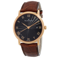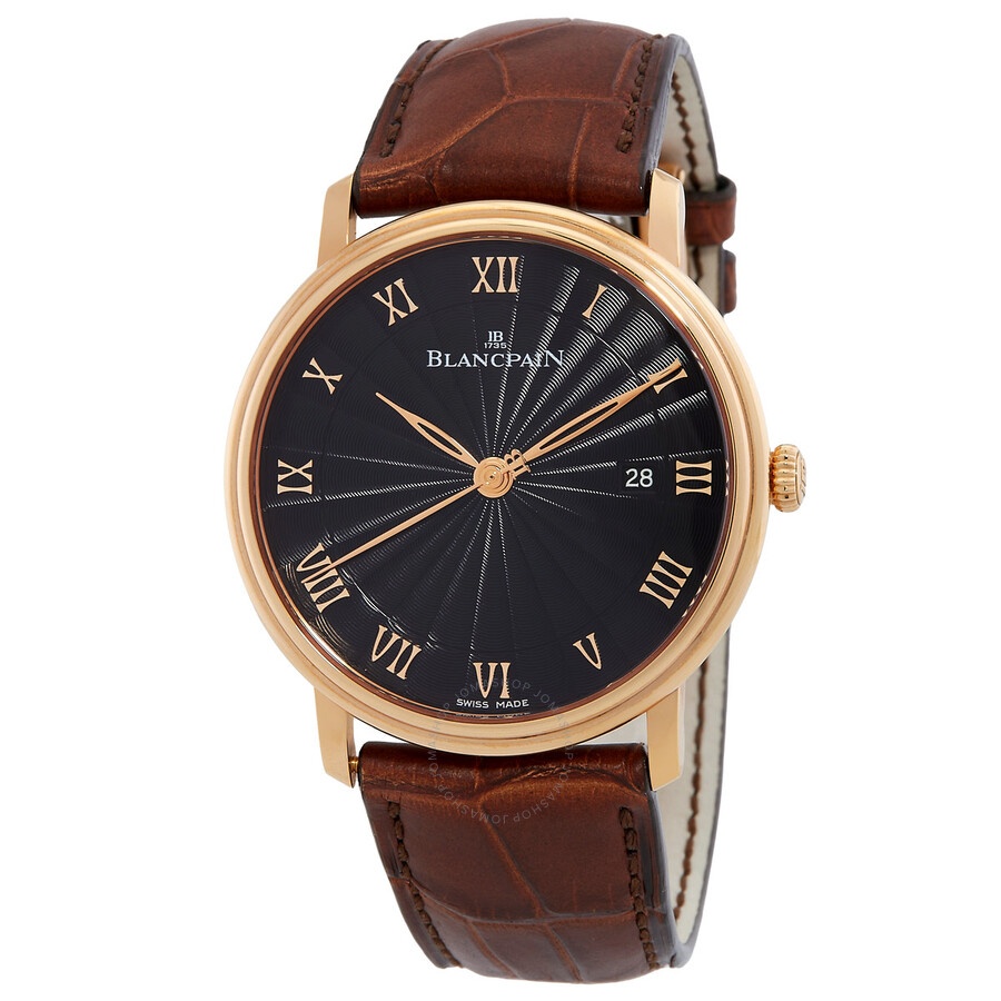 18kt rose gold case with a brown crocodile leather strap. Fixed 18kt rose gold bezel. Black dial with gold-toned leaf-style shape hands and Roman numeral hour markers. Dial Type: Analog. Date display at the 3 o'clock position. Blancpain Calibre 1151 Automatic movement, containing 28 Jewels, composed of 210 parts, bitting at 21600 vph, and has a power reserve of approximately 100 hours. Scratch resistant sapphire crystal. Pull / push crown. Round case shape, case size: 40 mm, case thickness: 8.6 mm. Deployment with push button release clasp. Water resistant at 30 meters / 100 feet. Functions: date, hour, minute, second. Villeret Series. Luxury watch style. Watch label: Swiss Made. Item Variations: 6651 3630 55B, 6651.3630.55B, 6651363055B. Blancpain Villeret Ultra Slim Black Dial 18kt Rose Gold Leather Men's Watch 6651-3630-55B. GENERAL Color: Black / Gold / Rose CASE Case Size: 40 Case Thickness: 8.6 mm Case Material: 18kt Rose Gold Case Shape: Round BAND Band Material: Crocodile Leather Band Type: Strap Band Color: Brown Clasp: Deployment with Push Button Release DIAL Dial Color: Black Type: Analog Crystal: Scratch Resistant Sapphire Hands: Gold-toned Leaf-style shape Dial Markers: Roman Numeral Bezel: Fixed Bezel Material: 18kt Rose Gold Crown: Pull / Push INFORMATION Brand: Blancpain Series: Villeret Collection Name: Villeret Gender: Mens Model: 6651-3630-55B Watch Label: Swiss Made Movement: Automatic Engine: Blancpain Calibre 1151 Power Reserve: 100 hours FEATURES Water Resistance: 30 meters / 100 feet Calendar: Date display at the 3 o'clock position Functions: Date, Hour, Minute, Second Watch Features: Analog, Gold, Leather ADDITIONAL INFO Watch Style: Luxury Warranty: 2 Year Jomashop Warranty Jomashop Sku: BLANC6651-3630-55B Item Variation: 6651 3630 55B, 6651.3630.55B, 6651363055B Department: Watches Category: Watches