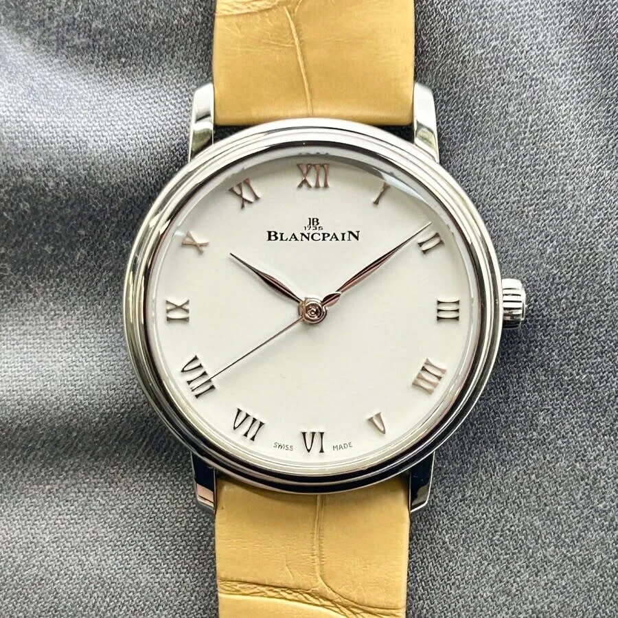 Silver-tone stainless steel case with a beige leather strap. Fixed silver-tone stainless steel bezel. White dial with silver-tone hands and Roman numeral hour markers. Dial Type: Analog. Blancpain Calibre 913 Automatic movement, containing 20 Jewels, composed of 174 parts, bitting at 21600 vph, and has a power reserve of approximately 40 hours. Transparent case back. Round case shape, case size: 29 mm, case thickness: 9.1 mm. Buckle clasp. Water resistant at 30 meters / 100 feet. Functions: hour, minute, second. Villeret Ultraplate Series. Luxury watch style. Watch label: Swiss Made. Blancpain Villeret Ultraplate Automatic White Dial Ladies Watch 6104-1127-95A. GENERAL Box Type: Original Box CASE Case Diameter: 29 mm Case Thickness: 9.1 mm Case Material: Stainless Steel Case Shape: Round Case Back: Transparent BAND Band Material: Leather Band Type: Strap Band Color: Beige Clasp: Buckle DIAL Dial Color: White Type: Analog Hands: Silver-tone Dial Markers: Roman Numeral Bezel: Fixed Bezel Color: Silver-tone Bezel Material: Stainless Steel INFORMATION Brand: Blancpain Series: Villeret Ultraplate Collection Name: Villeret Ultraplate Gender: Womens Model: 6104-1127-95A Watch Label: Swiss Made Movement: Automatic Engine: Blancpain Calibre 913 Power Reserve: 40 hours FEATURES Water Resistance: 30 meters / 100 feet Functions: Hour, Minute, Second Watch Features: Analog, Leather, Stainless Steel ADDITIONAL INFO Watch Style: Luxury Warranty: With Manufacturer's Guarantee Jomashop Sku: BLANC6104-1127-95A Department: Watches