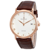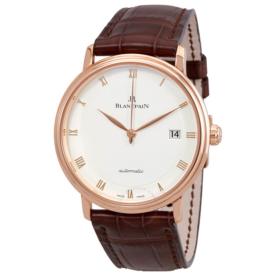 18kt rose gold case with a brown alligator leather strap. Fixed 18kt rose gold bezel. Opaline dial with rose gold-tone leaf-style shape hands and Roman numeral hour markers. Dial Type: Analog. Date display at the 3 o'clock position. Blancpain Calibre 1150 Automatic movement, containing 28 Jewels, composed of 210 parts, bitting at 21600 vph, and has a power reserve of approximately 100 hours. Scratch resistant sapphire crystal. Solid case back. Round case shape, case size: 38 mm. Pin buckle clasp. Water resistant at 30 meters / 100 feet. Functions: date, hour, minute, second. Villeret Ultraplate Series. Luxury watch style. Watch label: Swiss Made. Blancpain Villeret Ultraplate Opaline Dial 18K Rose Gold Automatic Men's Watch 6223-3642-55A. GENERAL Box Type: Original Box CASE Case Size: 38 Case Material: 18kt Rose Gold Case Shape: Round Case Back: Solid BAND Band Material: Alligator Leather Band Type: Strap Band Color: Brown Clasp: Pin Buckle DIAL Dial Color: Opaline Type: Analog Crystal: Scratch Resistant Sapphire Hands: Rose Gold-Tone Leaf-style shape Dial Markers: Roman Numeral Bezel: Fixed Bezel Material: 18kt Rose Gold INFORMATION Brand: Blancpain Series: Villeret Ultraplate Collection Name: Villeret Ultraplate Gender: Mens Model: 6223-3642-55A Watch Label: Swiss Made Movement: Automatic Engine: Blancpain Calibre 1150 Power Reserve: 100 hours FEATURES Water Resistance: 30 meters / 100 feet Calendar: Date display at the 3 o'clock position Functions: Date, Hour, Minute, Second Watch Features: Alligator Leather, Analog, Gold, Leather ADDITIONAL INFO Watch Style: Luxury Warranty: 2 Year Jomashop Warranty UPC Code: 7613297302783 Jomashop Sku: BLANC6223-3642-55A Department: Watches Category: Watches