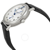 18kt white gold case with a black alligator leather strap. Fixed 18kt white gold bezel. Silver guilloche dial with blue Breguet-style shape hands and black Roman numeral hour markers. Minute markers. Dial Type: Analog. Two sub-dials displaying: retrograde second and power reserve indicator. Breguet Calibre 516DRSR Automatic movement, containing 34 Jewels, bitting at 28800 vph, and has a power reserve of approximately 65 hours. Scratch resistant sapphire crystal. Fluted 18kt white gold crown. Transparent case back. Round case shape, case size: 39 mm, case thickness: 9.85 mm. Deployment clasp. Water resistant at 30 meters / 100 feet. Functions: hours, minutes, retrograde seconds (jump-back), power reserve indicator. Classique Series. Luxury watch style. Watch label: Swiss Guilloche Main. Item Variations: 5207BB.129V6, 5207BB.12.9V6. Breguet Classique Automatic Ultra Slim Silver Dial Black Leather Men's Watch 5207BB129V6. GENERAL Box Type: Original Box Color: Black / Gold / Silver / White CASE Case Size: 39 Case Thickness: 9.85 mm Case Material: 18kt White Gold Case Shape: Round Case Back: Transparent BAND Band Material: Alligator Leather Band Type: Strap Band Color: Black Clasp: Deployment DIAL Dial Color: Silver Guilloche Type: Analog Crystal: Scratch Resistant Sapphire Hands: Blue Breguet-style shape Dial Markers: Black Roman Numeral Second Markers: Minute Markers Sub Dials: Two - Retrograde Second and Power Reserve Indicator Bezel: Fixed Bezel Material: 18kt White Gold Crown: Fluted 18kt White Gold INFORMATION Brand: Breguet Series: Classique Collection Name: Classique Gender: Mens Model: 5207BB129V6 Watch Label: Swiss Guilloche Main Movement: Automatic Engine: Breguet Calibre 516DRSR Power Reserve: 65 hours FEATURES Water Resistance: 30 meters / 100 feet Functions: Hours, Minutes, Retrograde seconds (jump-back), Power Reserve Indicator Watch Features: Alligator Leather, Analog, Retrograde, Power Reserve Indicator, Gold, Leather ADDITIONAL INFO Watch Style: Luxury Warranty: 2 Year Jomashop Warranty UPC Code: 7613049239961 Jomashop Sku: BRG5207BB129V6 Item Variation: 5207BB.129V6, 5207BB.12.9V6 Department: Watches Category: Watches