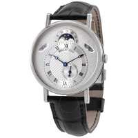 18kt white gold case with a black leather strap. Fixed 18kt white gold bezel. Silver dial with blue-toned Breguet-style hands and black Roman numeral hour markers. Minute markers around the outer rim. Dial Type: Analog. Day of the week display at the 2 o'clock position. Date display at the 2 o'clock position. Two sub-dials displaying: small second and moonphase. Breguet calibre 502.3 QSE1 automatic movement, containing 35 Jewels, bitting at 21600 vph, and has a power reserve of approximately 45 hours. Scratch resistant sapphire crystal. Pull / push crown. Transparent case back. Round case shape. Case size: 39 mm. Case thickness: 9.9 mm. Deployment clasp. Water resistant at 30 meters / 100 feet. Functions: moonphase, date, day, hour, minute, second. Classique Series. Luxury watch style. Watch label: Swiss Guilloche main. Breguet Classique Silver Dial 18kt White Gold Black Leather Men's Watch 7337BB1E9V6. GENERAL Box Type: Original Box Color: Black / Gold / Silver / White CASE Case Size: 39 Case Thickness: 9.9 mm Case Material: 18kt White Gold Case Shape: Round Case Back: Transparent BAND Band Material: Leather Band Type: Strap Band Color: Black Clasp: Deployment DIAL Dial Color: Silver Type: Analog Crystal: Scratch Resistant Sapphire Hands: Blue-toned Breguet-style Dial Markers: Black Roman Numeral Second Markers: Minute Markers around the outer rim Sub Dials: Two - Small Second and Moonphase Bezel: Fixed Bezel Material: 18kt White Gold Crown: Pull / Push INFORMATION Brand: Breguet Series: Classique Collection Name: Classique Gender: Mens Model: 7337BB/1E/9V6 Watch Label: Swiss Guilloche main Movement: Automatic Engine: Breguet Calibre 502.3 QSE1 Power Reserve: 45 hours FEATURES Water Resistance: 30 meters / 100 feet Calendar: Day of the Week Display at the 2 o'clock position.. Date Display at the 2 o'clock position Functions: Moonphase, Date, Day, Hour, Minute, Second Watch Features: Analog, Gold, Leather ADDITIONAL INFO Watch Style: Luxury Warranty: 2 Year Jomashop Warranty UPC Code: 7613049400866 Jomashop Sku: BRG7337BB1E9V6 Department: Watches Category: Watches