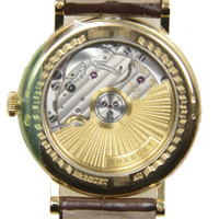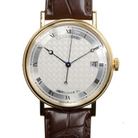 Yellow gold-tone 18kt yellow gold case with a brown leather strap. Fixed yellow gold-tone 18kt yellow gold bezel. Silver guilloche dial with blue hands and Roman numeral hour markers. Minute markers around the outer rim. Dial Type: Analog. Date display at the 3 o'clock position. Breguet Calibre 777Q Automatic movement, containing 26 Jewels, bitting at 28800 vph, and has a power reserve of approximately 44 hours. Scratch resistant sapphire crystal. Pull / push crown. Transparent case back. Round case shape, case size: 38 mm, case thickness: 8.25 mm. Deployment with push button release clasp. Water resistant at 30 meters / 100 feet. Functions: date, hour, minute, second. Classique Series. Casual watch style. Watch label: Swiss Made. Breguet Classique Silver Dial Brown Leather Men's Watch5177ba/12/9v6. GENERAL Box Type: Original Box Color: Blue / Gold / Silver / Yellow CASE Case Size: 38 Case Thickness: 8.25 mm Case Material: 18kt Yellow Gold Case Shape: Round Case Back: Transparent BAND Band Material: Leather Band Type: Strap Band Color: Brown Clasp: Deployment with Push Button Release DIAL Dial Color: Silver Guilloche Type: Analog Crystal: Scratch Resistant Sapphire Hands: Blue Dial Markers: Roman Numeral Second Markers: Minute Markers around the outer rim Bezel: Fixed Bezel Color: Yellow Gold-tone Bezel Material: 18kt Yellow Gold Crown: Pull / Push INFORMATION Brand: Breguet Series: Classique Collection Name: Classique Gender: Mens Model: 5177ba/12/9v6 Watch Label: Swiss Made Movement: Automatic Engine: Breguet Calibre 777Q Power Reserve: 55 hours FEATURES Water Resistance: 30 meters / 100 feet Calendar: Date display at the 3 o'clock position Functions: Date, Hour, Minute, Second Watch Features: Analog, Gold, Leather ADDITIONAL INFO Watch Style: Casual Warranty: 2 Year Jomashop Warranty Jomashop Sku: BRG5177BA129V6 Department: Watches Category: Watches