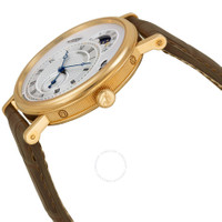 18kt rose gold case with a brown alligator leather strap. Fixed 18kt rose gold bezel. Silver guilloche dial with blue Breguet-style shape hands and Roman numeral hour markers. Minute markers. Dial Type: Analog. Day of the week display at 10 o'clock. date display at 2 o'clock. Moonphase centered at 12 o'clock. second sub-dial; at the 5 o'clock position subdials. Breguet Calibre 502.3 QSE1 Automatic movement, containing 35 Jewels, bitting at 21600 vph, and has a power reserve of approximately 45 hours. Scratch resistant sapphire crystal. Pull / push crown. Transparent case back. Round case shape, case size: 39 mm, case thickness: 9.9 mm. Deployment clasp. Water resistant at 30 meters / 100 feet. Functions: date, day, hour, minute, second, moon phase. Classique Series. Dress watch style. Watch label: Swiss Guilloche Main. Breguet Classique Silver Dial Brown Leather Strap Men's Watch 7337BR1E9V6. GENERAL Box Type: Original Box Color: Black / Blue / Gold / Rose / Silver / Skeleton CASE Case Size: 39 Case Thickness: 9.9 mm Case Material: 18kt Rose Gold Case Shape: Round Case Back: Transparent BAND Band Material: Alligator Leather Band Type: Strap Band Color: Brown Clasp: Deployment DIAL Dial Color: Silver Guilloche Type: Analog Crystal: Scratch Resistant Sapphire Hands: Blue Breguet-style shape Dial Markers: Roman Numeral Second Markers: Minute Markers Sub Dials: Moonphase centered at 12 o'clock. Second Sub-dial; at the 5 o'clock position Bezel: Fixed Bezel Material: 18kt Rose Gold Crown: Pull / Push INFORMATION Brand: Breguet Series: Classique Collection Name: Classique Gender: Mens Model: 7337BR1E9V6 Watch Label: Swiss Guilloche Main Movement: Automatic Engine: Breguet Calibre 502.3 QSE1 Power Reserve: 45 hours FEATURES Water Resistance: 30 meters / 100 feet Calendar: Day of the Week display at 10 o'clock. Date display at 2 o'clock Functions: Date, Day, Hour, Minute, Second, Moon Phase Watch Features: Alligator Leather, Analog, Gold, Leather, Moon Phase ADDITIONAL INFO Watch Style: Dress Warranty: 2 Year Jomashop Warranty Jomashop Sku: BRG7337BR1E9V6 Department: Watches Category: Watches