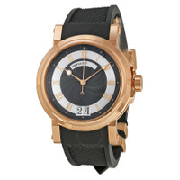 18kt rose gold case with a black rubber strap. Fixed 18kt rose gold bezel. Silver and black hand-guilloche dial with rose gold hands and Roman numeral hour markers. Minute markers around the outer rim. Dial Type: Analog. Luminescent hands and markers. Date display at the 6 o'clock position. Automatic movement with a 65-hour power reserve. Scratch resistant mineral crystal. Screw down crown. Skeleton case back. Case diameter: 39 mm. Case thickness: 12 mm. Round case shape. Band width: 22 mm. Deployment clasp with push button release. Water resistant at 100 meters / 330 feet. Functions: date, hour, minute, second. Casual watch style. Breguet Marine Automatic Silver Dial Black Rubber Men's Watch 5817BRZ25V8. GENERAL Box Type: Original Box Color: Black / Gold / Rose / Silver / Skeleton CASE Case Size: 39 Case Thickness: 12 mm Case Material: Gold Case Shape: Round Case Back: Skeleton BAND Band Material: Rubber Band Type: Strap Band Color: Black Band Width: 22 mm Clasp: Deployment with Push Button Release DIAL Dial Color: Silver and Black Hand-guilloche Type: Analog Crystal: Scratch Resistant Mineral Hands: Rose Gold Dial Markers: Roman Numeral Second Markers: Minute Markers around the outer rim Luminiscence: Hands and Markers Bezel: Fixed Bezel Color: 18kt Rose Bezel Material: Gold Crown: Screw Down INFORMATION Brand: Breguet Series: Marine Collection Name: Marine Gender: Mens Model: 5817BRZ25V8 Watch Label: Swiss Guilloche Main Movement: Automatic Engine: Breguet Calibre 517GG Power Reserve: 65 hours FEATURES Water Resistance: 100 meters / 330 feet Calendar: Date display at the 6 o'clock position Functions: Date, Hour, Minute, Second Watch Features: Analog, Gold, Rubber ADDITIONAL INFO Watch Style: Casual Warranty: 2 Year Jomashop Warranty UPC Code: 7613049345181 Jomashop Sku: BRG5817BRZ25V8 Department: Watches Category: Watches