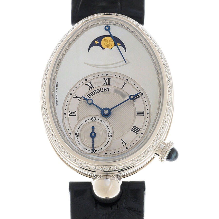 18kt white gold case with a black alligator/crocodile leather strap. Fixed 18kt white gold bezel with diamond set. Mother of pearl dial with blue hands and Roman numeral hour markers. Dial Type: Analog. Two sub-dials displaying: moonphase/power reserve indicator and small second. Breguet Calibre 537 DRL1 Automatic movement, containing 22 Jewels, composed of 230 parts, bitting at 21600 vph, and has a power reserve of approximately 40 hours. Scratch resistant sapphire crystal. Pull / push crown. Transparent case back. Oval case shape, case size: 28.48 mm x 36.5 mm, case thickness: 10.05 mm. Deployant buckle clasp. Water resistant at 30 meters / 100 feet. Functions: moon phase, hour, minute, small second, power reserve indicator. Reine De Naples Series. Luxury watch style. Breguet Reine De Naples Automatic Diamond Ladies Watch 8908bb/52/964/d00d3L. INFORMATION Brand: Breguet Series: Reine De Naples Collection Name: Reine De Naples Gender: Womens Model: 8908bb/52/964/d00d3L Movement: Automatic Engine: Breguet Calibre 537 DRL1 Power Reserve: 40 hours CASE Case Size: 28.48 mm x 36.5 mm Case Thickness: 10.05 mm Case Material: 18kt White Gold Case Shape: Oval Case Back: Transparent BAND Band Material: Alligator/Crocodile Leather Band Type: Strap Band Color: Black Clasp: Deployant Buckle DIAL Dial Color: Mother of Pearl Type: Analog Crystal: Scratch Resistant Sapphire Hands: Blue Dial Markers: Roman Numeral Sub Dials: Two - Moonphase/Power Reserve Indicator and Small Second Bezel: Fixed Bezel Color: 18kt White Gold Bezel Material: Diamond Set Crown: Pull / Push FEATURES Water Resistance: 30 meters / 100 feet Functions: Moon Phase, Hour, Minute, Small Second, Power Reserve Indicator Watch Features: Alligator Leather, Analog, Power Reserve Indicator, Gold, Leather, Moon Phase, Diamond ADDITIONAL INFO Watch Style: Luxury Jomashop Sku: BRG8908BB52964D00D3L Department: Watches Category: Watches