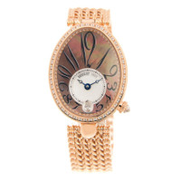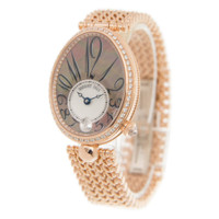 18kt rose gold case with a gold-tone rose gold plated bracelet. Fixed bezel with diamond set. Mother of pearl dial with black Arabic numeral hour markers. Dial Type: Analog. Breguet Calibre 537/3 Automatic movement, containing 26 Jewels, bitting at 21600 vph, and has a power reserve of approximately 45 hours. Scratch resistant sapphire crystal. Screw down crown. Solid case back. Oval case shape, case size: 28.45 mm x 36.5 mm, case thickness: 10.05 mm. Deployment clasp. Water resistant at 30 meters / 100 feet. Functions: hour, minute. Additional Info: bezel set with a total of 117 round diamonds (0.99 carats). Reine De Naples Series. Luxury watch style. Watch label: Swiss Made. Breguet Reine de Naples Automatic Diamond Ladies Watch 8918BR5TJ20D000. INFORMATION Brand: Breguet Series: Reine De Naples Collection Name: Reine de Naples Gender: Womens Model: 8918BR/5T/J20.D000 Watch Label: Swiss Made Movement: Automatic Engine: Breguet Calibre 537/3 Power Reserve: 45 hours CASE Case Size: 28.45 mm x 36.5 mm Case Thickness: 10.05 mm Case Material: 18kt Rose Gold Case Shape: Oval Case Back: Solid BAND Band Material: Rose Gold Plated Band Type: Bracelet Band Color: Gold-tone Clasp: Deployment DIAL Dial Color: Mother of Pearl Type: Analog Crystal: Scratch Resistant Sapphire Dial Markers: Black Arabic Numeral Bezel: Fixed Bezel Material: Diamond Set Crown: Screw Down FEATURES Water Resistance: 30 meters / 100 feet Functions: Hour, Minute Watch Features: Diamond, Gold, Analog ADDITIONAL INFO Watch Style: Luxury Warranty: 2 Year Jomashop Warranty Additional Info: bezel set with a total of 117 round diamonds (0.99 carats) Jomashop Sku: BRG8918BR5TJ20D000 Department: Watches Category: Watches