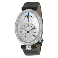 18kt white gold case with a black satin strap. Fixed 18kt white gold bezel set with diamonds. Mother of pearl dial with blue hands and Roman numeral hour markers. Minute markers around the outer rim. Dial Type: Analog. Two sub-dials displaying: 60 second and combined power reserve and moonphase. Breguet calibre 537 DRL1 automatic movement with a 40 hour power reserve. Scratch resistant sapphire crystal. Pull / push crown. Transparent case back. Case dimensions: 28.45 mm x 36.5 mm. Case thickness: 10.05 mm. Oval case shape. Band width: 17.8 mm. Band length: 7 inches. Deployant clasp. Water resistant at 30 meters / 100 feet. Functions: hour, minute, second, moonphase, 40 hour power reserve. Luxury watch style. Breguet Reine De Naples Mother of Pearl Dial 18kt White Gold Diamond Black Satin Ladies Watch 8908BB52864D00D. GENERAL Color: Black / Gold / Mother of pearl / White INFORMATION Brand: Breguet Series: Reine De Naples Collection Name: Reine de Naples Gender: Womens Model: 8908BB/52/864.D00D Watch Label: Swiss guilloche main Movement: Automatic Engine: Breguet Calibre 537 DRL1 Power Reserve: 40 hours CASE Case Size: 36.5 mm x 28.45 mm Case Thickness: 10.05 mm Case Material: 18kt White Gold Case Shape: Oval Case Back: Transparent BAND Band Material: Satin Band Type: Strap Band Color: Black Band Length: 7 inches Band Width: 17.8 mm Clasp: Deployment DIAL Dial Color: Mother of Pearl Type: Analog Crystal: Scratch Resistant Sapphire Hands: Blue Dial Markers: Roman Numeral Second Markers: Minute Markers around the outer rim Sub Dials: Two - 60 Second and Combined Power Reserve and Moonphase Bezel: Fixed Bezel Material: 18kt White Gold set with Diamonds Crown: Pull / Push FEATURES Water Resistance: 30 meters / 100 feet Calendar: Moon Calendar Functions: Hour, Minute, Second, Moonphase, Power Reserve Indicator Watch Features: Diamond, Gold, Power Reserve Indicator, Analog ADDITIONAL INFO Watch Style: Luxury Warranty: 2 Year Jomashop Warranty UPC Code: 7613049217860 Jomashop Sku: BRG8908BB52864D00D Item Variation: 8908BB/52/864 D00D, 8908BB/52/864-D00D, 8908BB/52/864/D00D, 8908BB/52/864D00D Department: Watches Category: Watches
