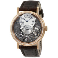 18kt rose gold case with a brown leather strap. Fixed 18kt rose gold bezel. Silver dial with blue Breguet-style shape hands and Roman numeral hour markers. Minute markers. Dial Type: Analog. One subdial displaying: retrograde second. Breguet Calibre 505 SR1 Automatic movement, containing 38 Jewels, bitting at 21600 vph, and has a power reserve of approximately 50 hours. Scratch resistant sapphire crystal. Pull / push crown. Transparent case back. Round case shape, case size: 40 mm, case thickness: 11.65 mm. Tang clasp. Water resistant at 30 meters / 100 feet. Functions: hour, minute, second. Tradition Series. Luxury watch style. Watch label: Swiss Made. Breguet Tradition Automatic Men's Watch 7097BR/G1/9WU. GENERAL Box Type: Original Box CASE Case Size: 40 Case Thickness: 11.65 mm Case Material: 18kt Rose Gold Case Shape: Round Case Back: Transparent BAND Band Material: Leather Band Type: Strap Band Color: Brown Clasp: Tang DIAL Dial Color: Silver Type: Analog Crystal: Scratch Resistant Sapphire Hands: Blue Breguet-style shape Dial Markers: Roman Numeral Second Markers: Minute Markers Sub Dials: One - Retrograde Second Bezel: Fixed Bezel Color: Rose Gold-tone Bezel Material: 18kt Rose Gold Crown: Pull / Push INFORMATION Brand: Breguet Series: Tradition Collection Name: Tradition Gender: Mens Model: 7097BR/G1/9WU Watch Label: Swiss Made Movement: Automatic Engine: Breguet Calibre 505 SR1 Power Reserve: 50 hours FEATURES Water Resistance: 30 meters / 100 feet Functions: Hour, Minute, Second Watch Features: Analog, Retrograde, Gold, Leather ADDITIONAL INFO Watch Style: Luxury Warranty: 2 Year Jomashop Warranty UPC Code: 7613049512644 Jomashop Sku: BRG7097BRG19WU Department: Watches Category: Watches
