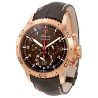 18kt rose gold case with a brown alligator leather strap. Uni-directional rotating 18kt rose gold bezel. Brown dial with luminous rose gold-tone hands and Arabic numeral hour markers. 30 second markers. Minute markers. Dial Type: Analog. Luminescent hands. Date display at the 6 o'clock position. Three sub-dials displaying: 12 hour, 30 minute and 24 hour. Breguet calibre 589 F automatic movement with a 45-hour power reserve. Scratch resistant sapphire crystal. Screw down crown. Solid with skeletal window case back. Case size: 44 mm. Case thickness: 18 mm. Round case shape. Deployment clasp. Water resistant at 100 meters / 330 feet. Functions: chronograph, flyback, date, second time zone, hour, second. Luxury watch style. Watch label: Swiss Made. Breguet Transatlantique Type XXII Flyback Men's Watch 3880BRZ29XV. GENERAL Box Type: Original Box CASE Case Size: 44 Case Thickness: 18 mm Case Material: Gold Case Shape: Round Case Back: Solid with Skeletal Window BAND Band Material: Alligator Leather Band Type: Strap Band Color: Brown Clasp: Deployment DIAL Dial Color: Brown Type: Analog Crystal: Scratch Resistant Sapphire Hands: Luminous Rose Gold-tone Dial Markers: Arabic Numeral Second Markers: 30 Second markers. Minute Markers Sub Dials: Three - 12 Hour, 30 Minute and 24 Hour Luminiscence: Hands Bezel: Uni-directional Rotating Bezel Color: 18kt Rose Bezel Material: Gold Crown: Screw Down INFORMATION Brand: Breguet Series: Transatlantique Type Xxii Flyback Collection Name: Transatlantique Type XXII Flyback Gender: Mens Model: 3880BRZ29XV Watch Label: Swiss Made Movement: Automatic Engine: Breguet Calibre 589 F Power Reserve: 45 hours FEATURES Water Resistance: 100 meters / 330 feet Calendar: Date display at the 6 o'clock position Functions: Chronograph, FlyBack, Date, Second Time Zone, Hour, Second Watch Features: Alligator Leather, Analog, Flyback, Gold, Leather, Chronograph, Time Zone ADDITIONAL INFO Watch Style: Luxury Warranty: 2 Year Jomashop Warranty UPC Code: 7613049467234 Jomashop Sku: BRG3880BRZ29XV Department: Watches Category: Watches