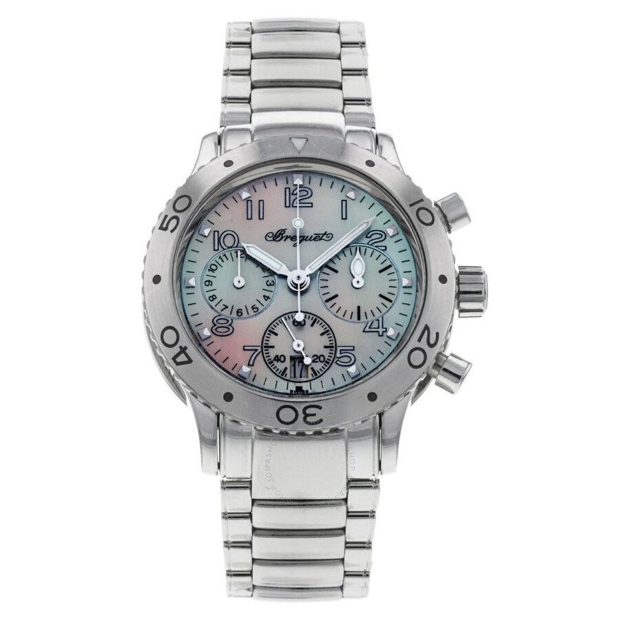 Stainless steel case with a stainless steel bracelet. Uni-directional bezel. Mother of pearl dial with luminous hands and Arabic hour markers. Minute markers around the outer rim. Dial Type: Analog. Date display at the 6 o'clock position. Chronograph - three sub-dials displaying: 60 second, 60 minute and 12 hour. Caliber 550 automatic movement with about 48 hours of power reserve. Scratch resistant sapphire crystal. Screw down crown. Case size: 33.5 mm. Case thickness: 11.8 mm. Round case shape. Hidden folding clasp. Water resistant at 100 meters / 330 feet. Functions: chronograph, date, hour, minute, second. Luxury watch style. Watch label: Swiss. Breguet Type XX Transatlantique Mother of Pearl Dial Stainless Steel Ladies Watch 4820ST59S76. GENERAL Box Type: Original Box Color: Mother of pearl CASE Case Size: 33 Case Thickness: 11.8 mm Case Material: Stainless Steel Case Shape: Round BAND Band Material: Stainless Steel Band Type: Bracelet Band Color: Silver-tone Clasp: Hidden Fold Over DIAL Dial Color: Mother of Pearl Type: Analog Crystal: Scratch Resistant Sapphire Hands: Luminous Dial Markers: Arabic Second Markers: Minute Markers around the outer rim Sub Dials: Three - 60 Second, 60 Minute and 12 Hour Bezel: Uni-directional Bezel Color: Silver-tone Crown: Screw Down INFORMATION Brand: Breguet Series: Type Xx Transatlantique Collection Name: Type XX Transatlantique Gender: Womens Model: 4820ST/59/S76 Watch Label: Swiss Movement: Automatic Engine: Breguet Calibre 550 Power Reserve: 48 hours FEATURES Water Resistance: 100 meters / 330 feet Calendar: Date display at the 6 o'clock position Functions: Chronograph, Date, Hour, Minute, Second Watch Features: Analog, Stainless Steel, Chronograph ADDITIONAL INFO Watch Style: Luxury Warranty: 2 Year Jomashop Warranty Jomashop Sku: BRG4820ST59S76 Department: Watches Category: Watches