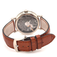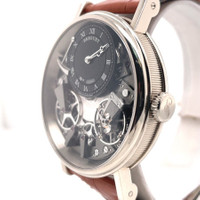 18kt white gold case with a brown leather strap. Fixed 18kt white gold bezel. Black and grey skeleton dial with silver-tone hands and Roman numeral hour markers. Minute markers around the outer rim. Dial Type: Analog. Breguet Calibre 507 DR Hand Wind movement, containing 34 Jewels, composed of 215 parts, bitting at 21600 vph, and has a power reserve of approximately 50 hours. Scratch resistant sapphire crystal. Pull / push crown. Transparent case back. Round case shape, case size: 40 mm, case thickness: 11.65 mm. Band width: 13 mm. Buckle clasp. Water resistant at 30 meters / 100 feet. Functions: hour, minute, power reserve indicator. Tradition Series. Luxury watch style. Watch label: Swiss Made. Pre-owned Breguet Tradition Hand Wind Men's Watch 7057BB/G9/9W6. GENERAL Collection Name: Tradition INFORMATION Brand: Breguet Series: Tradition Model: 7057BB/G9/9W6 Gender: Mens Watch Label: Swiss Made Movement: Hand Wind Engine: Breguet Calibre 507 DR Power Reserve: 50 hours CONDITION INFORMATION Box: Yes Preowned Item Condition: Excellent Papers: Yes CASE Case Size: 40 mm Case Thickness: 11.65 mm Case Material: 18kt White Gold Case Shape: Round Case Back: Transparent DIAL Type: Analog Dial Color: Black and Grey Skeleton Crystal: Scratch Resistant Sapphire Hands: Silver-tone Second Markers: Minute Markers around the outer rim Dial Markers: Roman Numeral Bezel: Fixed Bezel Color: 18kt White Gold Bezel Material: 18kt White Gold Crown: Pull / Push BAND Band Type: Strap Band Material: Leather Band Color: Brown Band Width: 13 mm Clasp: Buckle FEATURES Water Resistance: 30 meters / 100 feet Functions: Hour, Minute, Power Reserve Indicator Watch Features: Leather, Gold, Power Reserve Indicator, Analog ADDITIONAL INFO Watch Style: Luxury Warranty: 1 Year Jomashop Warranty UPC Code: 7613049426446 Jomashop Sku: PRE-P-BRG50403 Department: Watches Category: Watches