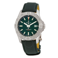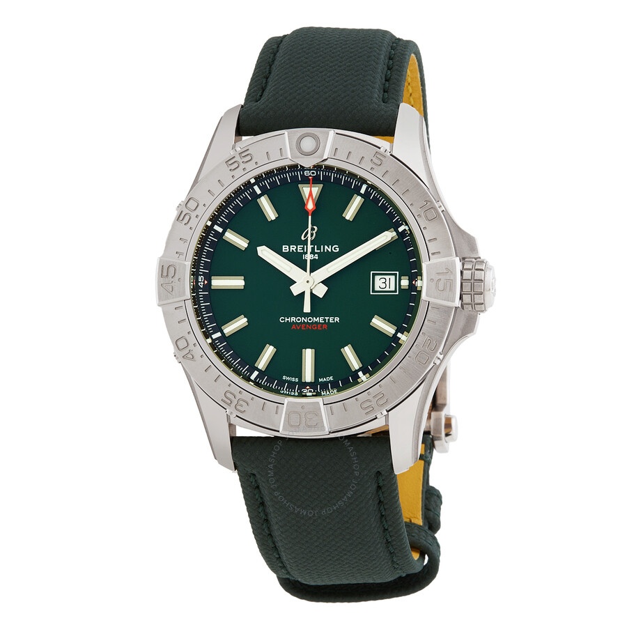 Silver-tone stainless steel case with a green calfskin leather strap. Uni-directional rotating silver-tone stainless steel bezel. Green dial with silver-tone hands and index hour markers. Minute markers around the outer rim. Dial Type: Analog. Luminescent hands and markers. Date display at the 3 o'clock position. Breitling Calibre 17 Automatic movement, based upon ETA 2824-2, containing 25 Jewels, bitting at 28800 vph, and has a power reserve of approximately 42 hours. Scratch resistant sapphire crystal. Screw down crown. Solid case back. Round case shape, case size: 42 mm, case thickness: 12.1 mm. Folding clasp. Water resistant at 300 meters / 1000 feet. Functions: date, hour, minute, second. Avenger Series. Sport watch style. Watch label: Swiss Made. Breitling Avenger Automatic Green Dial Men's Watch A17328101L1X1. INFORMATION Brand: Breitling Series: Avenger Collection Name: Avenger Gender: Mens Model: A17328101L1X1 Watch Label: Swiss Made Movement: Automatic Engine: Breitling Calibre 17 Power Reserve: 38 hours CASE Case Size: 42 mm Case Thickness: 12.1 mm Case Material: Stainless Steel Case Shape: Round Case Back: Solid BAND Band Material: Calfskin leather Band Type: Strap Band Color: Green Clasp: Folding clasp DIAL Dial Color: Green Type: Analog Crystal: Scratch Resistant Sapphire Hands: Silver-tone Dial Markers: Index Second Markers: Minute Markers around the outer rim Luminiscence: Hands and Markers Bezel: Uni-directional Rotating Bezel Color: Silver-tone Bezel Material: Stainless Steel Crown: Screw Down FEATURES Water Resistance: 300 meters / 1000 feet Calendar: Date display at the 3 o'clock position Functions: Date, Hour, Minute, Second Watch Features: Stainless Steel, Leather, Analog ADDITIONAL INFO Watch Style: Sport Warranty: 2 Year Jomashop Warranty Jomashop Sku: BTA17328101L1X1 Department: Watches Category: Watches