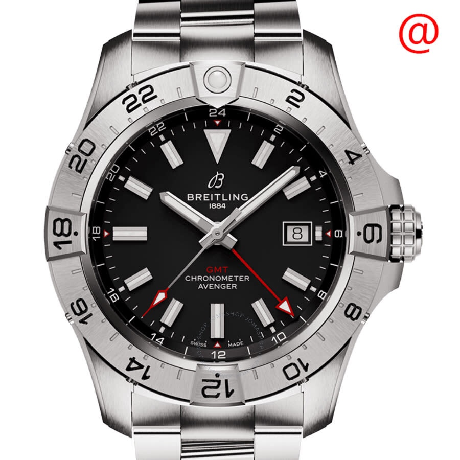 Silver-tone stainless steel case and bracelet. Bi-directional rotating silver-tone stainless steel bezel. Black dial with silver-tone hands and index hour markers. Minute markers around the outer rim. Dial Type: Analog. Luminescent hands and markers. Date display at the 3 o'clock position. Breitling Calibre 32 Automatic movement, based upon ETA 2893-2, containing 21 Jewels, bitting at 28800 vph, and has a power reserve of approximately 42 hours. Scratch resistant sapphire crystal. Screw down crown. Solid case back. Round case shape, case size: 44 mm, case thickness: 12 mm. Folding clasp. Water resistant at 300 meters / 1000 feet. Functions: GMT, second time zone, hour, minute, second. Avenger Series. Sport watch style. Watch label: Swiss Made. Breitling Avenger Automatic Black Dial Men's Watch A32320101B1A1. INFORMATION Brand: Breitling Series: Avenger Collection Name: Avenger Gender: Mens Model: A32320101B1A1 Watch Label: Swiss Made Movement: Automatic Engine: Breitling Calibre 32 Power Reserve: 42 hours CASE Case Size: 44 mm Case Thickness: 12 mm Case Material: Stainless Steel Case Shape: Round Case Back: Solid BAND Band Material: Stainless Steel Band Type: Bracelet Band Color: Silver-tone Clasp: Folding DIAL Dial Color: Black Type: Analog Crystal: Scratch Resistant Sapphire Hands: Silver-tone Dial Markers: Index Second Markers: Minute Markers around the outer rim Luminiscence: Hands and Markers Bezel: Bi-directional Rotating Bezel Color: Silver-tone Bezel Material: Stainless Steel Crown: Screw Down FEATURES Water Resistance: 300 meters / 1000 feet Calendar: Date display at the 3 o'clock position Functions: GMT, Second Time Zone, Hour, Minute, Second Watch Features: Time Zone, Stainless Steel, GMT, Analog ADDITIONAL INFO Watch Style: Sport Warranty: 2 Year Jomashop Warranty Jomashop Sku: BTA32320101B1A1 Department: Watches Category: Watches