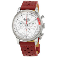 Silver-tone stainless steel case with a red calfskin leather strap. Fixed silver-tone stainless steel bezel. White dial with silver-tone hands and index hour markers. Minute markers around the outer rim. Dial Type: Analog. Luminescent hands. Chronograph - three sub-dials displaying: 60 second, 30 minute and 12 hour. Breitling Calibre 01 Automatic movement, containing 47 Jewels, composed of 346 parts, bitting at 28800 vph, and has a power reserve of approximately 70 hours. Scratch resistant sapphire crystal. Pull / push crown. Transparent case back. Round case shape, case size: 41 mm, case thickness: 13 mm. Band width: 20 mm. Deployant clasp. Water resistant at 100 meters / 330 feet. Functions: chronograph, column wheel, date, hour, minute, second, chronometer. Premier Series. Luxury watch style. Watch label: Swiss Made. Breitling B01 Top Time Ford Thunderbird Chronograph Automatic Chronometer Men's Watch AB01766A1A1X1. INFORMATION Brand: Breitling Series: Premier Collection Name: Premier Gender: Mens Model: AB01766A1A1X1 Watch Label: Swiss Made Movement: Automatic Engine: Breitling Calibre 01 Power Reserve: 70 hours CASE Case Size: 41 mm Case Thickness: 13 mm Case Material: Stainless Steel Case Shape: Round Case Back: Transparent BAND Band Material: Calfskin Leather Band Type: Strap Band Color: Red Band Width: 20 mm Clasp: Deployant Clasp DIAL Dial Color: White Type: Analog Crystal: Scratch Resistant Sapphire Hands: Silver-tone Dial Markers: Index Second Markers: Minute Markers around the outer rim Sub Dials: Three - 60 Second, 30 Minute and 12 Hour Luminiscence: Hands Bezel: Fixed Bezel Color: Silver-tone Bezel Material: Stainless Steel Crown: Pull / Push FEATURES Water Resistance: 100 meters / 330 feet Functions: Chronograph, Column Wheel, Date, Hour, Minute, Second, Chronometer Watch Features: Chronograph, Stainless Steel, Leather, Chronometer, Analog ADDITIONAL INFO Watch Style: Luxury Warranty: 2 Year Jomashop Warranty Jomashop Sku: BTAB01766A1A1X1 Department: Watches Category: Watches