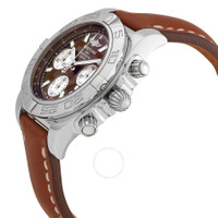 Silver-tone stainless steel case with a brown leather strap. Uni-directional rotating bezel. Brown dial with silver-tone hands and index hour markers. Minute markers around the outer rim. Dial Type: Analog. Luminescent hands and markers. Date display between 4 and 5 o'clock position. Chronograph - three sub-dials displaying: 60 second, 30 minute and 12 hours. Breitling Calibre 01 Automatic movement, containing 47 Jewels, composed of 346 parts, bitting at 28800 vph, and has a power reserve of approximately 70 hours. Scratch resistant sapphire crystal. Screw down crown. Round case shape, case size: 41 mm. Tang clasp. Water resistant at 300 meters / 1000 feet. Functions: chronograph, date, hour, minute, second. Chronomat 41 Series. Luxury watch style. Watch label: Swiss Made. Breitling Chronomat 41 Chronograph Automatic Men's Watch AB014012/Q583.425X.A18BA.1. CASE Case Size: 41 Case Material: Stainless Steel Case Shape: Round BAND Band Material: Leather Band Type: Strap Band Color: Brown Clasp: Tang DIAL Dial Color: Brown Type: Analog Crystal: Scratch Resistant Sapphire Hands: Silver-tone Dial Markers: Index Second Markers: Minute Markers around the outer rim Sub Dials: Three - 60 Second, 30 Minute and 12 Hours Luminiscence: Hands and Markers Bezel: Uni-directional Rotating Crown: Screw Down INFORMATION Brand: Breitling Series: Chronomat 41 Collection Name: Chronomat 41 Gender: Mens Model: AB014012/Q583.425X.A18BA.1 Watch Label: Swiss Made Movement: Automatic Engine: Breitling Calibre 01 Power Reserve: 70 hours FEATURES Water Resistance: 300 meters / 1000 feet Calendar: Date display between 4 and 5 o'clock position Functions: Chronograph, Date, Hour, Minute, Second Watch Features: Analog, Leather, Stainless Steel, Chronograph ADDITIONAL INFO Watch Style: Luxury Warranty: 2 Year Jomashop Warranty Jomashop Sku: BTAB014012-Q583BRLT Department: Watches Category: Watches