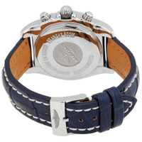 Silver-tone polished stainless steel case with a blue crocodile leather strap. Uni-directional rotating stainless steel bezel. Silver dial with silver-tone hands and index hour markers. Tachymeter. Dial Type: Analog. Luminescent hands and markers. Date display between 4 and 5 o'clock position. Chronograph - three sub-dials displaying: 60 second, 30 minute and 12 hours. Breitling Calibre 01 Automatic movement, containing 47 Jewels, composed of 346 parts, bitting at 28800 vph, and has a power reserve of approximately 70 hours. Scratch resistant sapphire crystal. Screw down crown. Solid case back. Round case shape, case size: 41 mm. Tang clasp. Water resistant at 300 meters / 1000 feet. Functions: chronograph, date, hour, minute, second. Chronomat 41 Series. Luxury watch style. Watch label: Swiss Made. Breitling Chronomat 41 Chronograph Automatic Silver Dial Men's Watch AB014012/G711.718P.A18BA.1. CASE Case Size: 41 Case Material: Polished Stainless Steel Case Shape: Round Case Back: Solid BAND Band Material: Crocodile Leather Band Type: Strap Band Color: Blue Clasp: Tang DIAL Dial Color: Silver Type: Analog Crystal: Scratch Resistant Sapphire Hands: Silver-tone Dial Markers: Index Second Markers: Tachymeter Sub Dials: Three - 60 Second, 30 Minute and 12 Hours Luminiscence: Hands and Markers Bezel: Uni-directional Rotating Bezel Material: Stainless Steel Crown: Screw Down INFORMATION Brand: Breitling Series: Chronomat 41 Collection Name: Chronomat 41 Gender: Mens Model: AB014012/G711.718P.A18BA.1 Watch Label: Swiss Made Movement: Automatic Engine: Breitling Calibre 01 FEATURES Water Resistance: 300 meters / 1000 feet Calendar: Date display between 4 and 5 o'clock position Functions: Chronograph, Date, Hour, Minute, Second Watch Features: Analog, Leather, Stainless Steel, Chronograph ADDITIONAL INFO Watch Style: Luxury Warranty: 2 Year Jomashop Warranty Jomashop Sku: BTAB014012-G711BLCLT Department: Watches Category: Watches