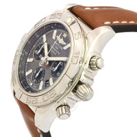 Silver-tone stainless steel case with a brown leather strap. Uni-directional rotating silver-tone stainless steel bezel. Grey dial with silver-tone hands and index hour markers. Minute markers. 1/100th markers. Tachymeter markings around the outer rim. Dial Type: Analog. Luminescent hands and markers. Date display between 4 and 5 o'clock position. Chronograph - three sub-dials displaying: 60 second, 30 minute and 12 hour. Breitling Calibre 01 Automatic movement, containing 47 Jewels, composed of 346 parts, bitting at 28800 vph, and has a power reserve of approximately 70 hours. Scratch resistant sapphire crystal. Screw locked - two gaskets crown. Solid case back. Round case shape, case size: 43.5 mm, case thickness: 16.95 mm. Band width: 22-20 mm. Tang clasp. Water resistant at 500 meters / 1650 feet. Functions: chronograph, chronometer, date, hour, minute, second, tachymeter. Chronomat 44 Series. Luxury watch style. Watch label: Swiss Made. Breitling Chronomat 44 Chronograph Automatic Chronometer Grey Dial Men's Watch AB011012/F546.435X.A20BA.1. CASE Case Size: 43 Case Thickness: 16.95 mm Case Material: Stainless Steel Case Shape: Round Case Back: Solid BAND Band Material: Leather Band Type: Strap Band Color: Brown Band Width: 22-20 mm Clasp: Tang DIAL Dial Color: Grey Type: Analog Crystal: Scratch Resistant Sapphire Hands: Silver-tone Dial Markers: Index Second Markers: Minute Markers. 1/100th Markers. Tachymeter Markings around the outer rim Sub Dials: Three - 60 Second, 30 Minute and 12 Hour Luminiscence: Hands and Markers Bezel: Uni-directional Rotating Bezel Color: Silver-tone Bezel Material: Stainless Steel Crown: Screw Locked - Two Gaskets INFORMATION Brand: Breitling Series: Chronomat 44 Collection Name: Chronomat 44 Gender: Mens Model: AB011012/F546.435X.A20BA.1 Watch Label: Swiss Made Movement: Automatic Engine: Breitling Calibre 01 Power Reserve: 70 hours FEATURES Water Resistance: 500 meters / 1650 feet Calendar: Date display between 4 and 5 o'clock position Functions: Chronograph, Chronometer, Date, Hour, Minute, Second, Tachymeter Watch Features: Analog, Chronometer, Leather, Stainless Steel, Chronograph ADDITIONAL INFO Watch Style: Luxury Warranty: 2 Year Jomashop Warranty Jomashop Sku: BTAB011012F546435XA2 Department: Watches Category: Watches