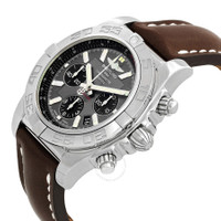 Silver-tone stainless steel case with a brown leather strap. Uni-directional rotating silver-tone stainless steel bezel. Grey dial with silver-tone hands and index hour markers. Tachymeter. Dial Type: Analog. Luminescent hands and markers. Date display between 4 and 5 o'clock position. Chronograph - three sub-dials displaying: 60 second, 30 minute and 12 hours. Breitling Calibre B01 automatic movement with a 70-hour power reserve. Scratch resistant sapphire crystal. Screw down crown. Solid case back. Round case shape, case size: 44 mm. Tang clasp. Water resistant at 500 meters / 1650 feet. Functions: chronograph, date, hour, minute, second. Chronomat 44 Series. Dive watch style. Watch label: Swiss Made. Breitling Chronomat 44 Chronograph Automatic Grey Dial Men's Watch AB011012/F546.131S.A20S.1. CASE Case Size: 44 Case Material: Stainless Steel Case Shape: Round Case Back: Solid BAND Band Material: Leather Band Type: Strap Band Color: Brown Clasp: Tang DIAL Dial Color: Grey Type: Analog Crystal: Scratch Resistant Sapphire Hands: Silver-tone Dial Markers: Index Second Markers: Tachymeter Sub Dials: Three - 60 Second, 30 Minute and 12 Hours Luminiscence: Hands and Markers Bezel: Uni-directional Rotating Bezel Color: Silver-tone Bezel Material: Stainless Steel Crown: Screw Down INFORMATION Brand: Breitling Series: Chronomat 44 Collection Name: Chronomat 44 Gender: Mens Model: AB011012/F546.131S.A20S.1 Watch Label: Swiss Made Movement: Automatic Engine: Breitling Calibre B01 Power Reserve: 70 hours FEATURES Water Resistance: 500 meters / 1650 feet Calendar: Date display between 4 and 5 o'clock position Functions: Chronograph, Date, Hour, Minute, Second Watch Features: Analog, Leather, Stainless Steel, Chronograph ADDITIONAL INFO Watch Style: Dive Warranty: 2 Year Jomashop Warranty Jomashop Sku: BTAB011012F546131SA2 Department: Watches Category: Watches