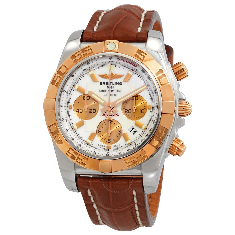 Silver-tone stainless steel case with a brown crocodile leather strap. Uni-directional rotating 18kt rose gold bezel. Antarctic white dial with rose gold hands and index hour markers. Tachymeter. Dial Type: Analog. Luminescent hands and markers. Date display between 4 and 5 o'clock position. Chronograph - three sub-dials displaying: 60 second, 30 minute and 12 hours. Automatic movement. Scratch resistant sapphire crystal. Screw down crown. Solid case back. Round case shape, case size: 43.5 mm. Tang clasp. Water resistant at 500 meters / 1650 feet. Functions: chronograph, date, hour, minute, second. Chronomat 44 Series. Luxury watch style. Watch label: Swiss Made. Breitling Chronomat 44 Chronograph Automatic Men's Watch CB011012/A696.748P.A20BA.1. GENERAL Box Type: Original Box CASE Case Size: 43 Case Material: Stainless Steel Case Shape: Round Case Back: Solid BAND Band Material: Crocodile Leather Band Type: Strap Band Color: Brown Clasp: Tang DIAL Dial Color: Antarctic White Type: Analog Crystal: Scratch Resistant Sapphire Hands: Rose Gold Dial Markers: Index Second Markers: Tachymeter Sub Dials: Three - 60 Second, 30 Minute and 12 Hours Luminiscence: Hands and Markers Bezel: Uni-directional Rotating Bezel Material: 18kt Rose Gold Crown: Screw Down INFORMATION Brand: Breitling Series: Chronomat Collection Name: Chronomat 44 Gender: Mens Model: CB011012/A696.748P.A20BA.1 Watch Label: Swiss Made Movement: Automatic FEATURES Water Resistance: 500 meters / 1650 feet Calendar: Date display between 4 and 5 o'clock position Functions: Chronograph, Date, Hour, Minute, Second Watch Features: Analog, Gold, Leather, Stainless Steel, Chronograph ADDITIONAL INFO Watch Style: Luxury Warranty: 2 Year Jomashop Warranty Jomashop Sku: BTCB011012-A696GNCT Department: Watches Category: Watches