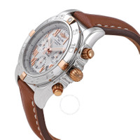 Silver-tone stainless steel case with a brown leather strap. Mother of pearl dial with rose gold-tone hands and Roman numeral hour markers. Tachymeter. Dial Type: Analog. Luminescent hands and markers. Date display between 4 and 5 o'clock position. Chronograph - three sub-dials displaying: 60 second, 30 minute and 12 hours. Automatic movement. Scratch resistant sapphire crystal. Screw down crown. Round case shape, case size: 44 mm. Tang clasp. Water resistant at 500 meters / 1650 feet. Functions: chronograph, date, hour, minute, second. Chronomat 44 Series. Dive watch style. Watch label: Swiss Made. Breitling Chronomat 44 Chronograph Automatic Men's Watch IB011012/A693.433X.A20BA.1. CASE Case Size: 44 Case Material: Stainless Steel Case Shape: Round BAND Band Material: Leather Band Type: Strap Band Color: Brown Clasp: Tang DIAL Dial Color: Mother of Pearl Type: Analog Crystal: Scratch Resistant Sapphire Hands: Rose Gold-tone Dial Markers: Roman Numeral Second Markers: Tachymeter Sub Dials: Three - 60 Second, 30 Minute and 12 Hours Luminiscence: Hands and Markers Crown: Screw Down INFORMATION Brand: Breitling Series: Chronomat 44 Collection Name: Chronomat 44 Gender: Mens Model: IB011012/A693.433X.A20BA.1 Watch Label: Swiss Made Movement: Automatic FEATURES Water Resistance: 500 meters / 1650 feet Calendar: Date display between 4 and 5 o'clock position Functions: Chronograph, Date, Hour, Minute, Second Watch Features: Analog, Gold, Leather, Stainless Steel, Chronograph ADDITIONAL INFO Watch Style: Dive Warranty: 2 Year Jomashop Warranty Jomashop Sku: BTIB011012-A693BRLT Department: Watches Category: Watches