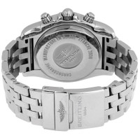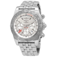 Silver-tone stainless steel case and bracelet. Bi-directional rotating silver-tone stainless steel bezel. Silver dial with silver-tone hands and stick hour markers. Minute markers andGMT scale. Tachymeter around the outer rim. Dial Type: Analog. Luminescent hands and markers. Date display between 4 and 5 o'clock position. Chronograph - three sub-dials displaying: 60 second, 30 minute and 12 hour. Breitling Calibre 04 Automatic movement, based upon Breitling Calibre 01, containing 47 Jewels, bitting at 28000 vph, and has a power reserve of approximately 70 hours. Scratch resistant sapphire crystal. Screw locked crown. Solid case back. Round case shape, case size: 44 mm, case thickness: 16.9 mm. Band width: 22 mm. Fold over clasp with a safety release. Water resistant at 200 meters / 660 feet. Functions: chronograph, date, hour, minute, second, GMT, second time zone, chronometer. Chronomat 44 Gmt Series. Luxury watch style. Watch label: Swiss Made. Breitling Chronomat 44 GMT Chronograph Automatic Chronometer Silver Dial Men's Watch AB042011/C851.375A. CASE Case Size: 44 Case Thickness: 16.9 mm Case Material: Stainless Steel Case Shape: Round Case Back: Solid BAND Band Material: Stainless Steel Band Type: Bracelet Band Color: Silver-tone Band Width: 22 mm Clasp: Fold Over with Safety Release DIAL Dial Color: Silver Type: Analog Crystal: Scratch Resistant Sapphire Hands: Silver-tone Dial Markers: Stick Second Markers: Minute Markers andGMT scale. Tachymeter around the outer rim Sub Dials: Three - 60 Second, 30 Minute and 12 Hour Luminiscence: Hands and Markers Bezel: Bi-directional Rotating Bezel Color: Silver-tone Bezel Material: Stainless Steel Crown: Screw Locked INFORMATION Brand: Breitling Series: Chronomat 44 Gmt Collection Name: Chronomat 44 GMT Gender: Mens Model: AB042011/C851.375A Watch Label: Swiss Made Movement: Automatic Engine: Breitling Calibre 04 Power Reserve: 70 hours FEATURES Water Resistance: 200 meters / 660 feet Calendar: Date display between 4 and 5 o'clock position Functions: Chronograph, Date, Hour, Minute, Second, GMT, Second Time Zone, Chronometer Watch Features: Analog, Time Zone, Chronograph, Stainless Steel, GMT, Chronometer ADDITIONAL INFO Watch Style: Luxury Warranty: 2 Year Jomashop Warranty Jomashop Sku: BTAB042011C851375A Department: Watches Category: Watches