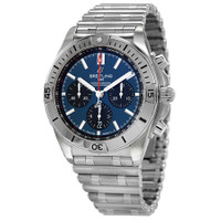 Silver-tone stainless steel case and bracelet. Uni-directional rotating stainless steel bezel. Blue dial with luminous silver-tone hands and index hour markers. Minute markers. 1/100th second markers. Tachymeter markings around the outer rim. Dial Type: Analog. Luminescent hands and markers. Date display at the 6 o'clock position. Chronograph - three sub-dials displaying: 60 second, 30 minute and 12 hour. Breitling Calibre 01 Automatic movement, containing 47 Jewels, composed of 346 parts, bitting at 28800 vph, and has a power reserve of approximately 70 hours. Scratch resistant sapphire crystal. Screw locked crown. Transparent case back. Round case shape, case size: 42 mm, case thickness: 15.10 mm. Band width: 22 / 20 mm. Fold over clasp with a push button release. Water resistant at 200 meters / 660 feet. Functions: chronograph, tachymeter, date, hour, minute, second. Chronomat B01 42 Series. Luxury watch style. Watch label: Swiss Made. Breitling Chronomat B01 42 Chronograph Automatic Blue Dial Men's Watch AB0134101C1A1. INFORMATION Brand: Breitling Series: Chronomat B01 42 Collection Name: Chronomat B01 42 Gender: Mens Model: AB0134101C1A1 Watch Label: Swiss Made Movement: Automatic Engine: Breitling Calibre 01 Power Reserve: 70 Hour CASE Case Size: 42 mm Case Thickness: 15.10 mm Case Material: Stainless Steel Case Shape: Round Case Back: Transparent BAND Band Material: Stainless Steel Band Type: Bracelet Band Color: Silver-tone Band Width: 22 / 20 mm Clasp: Fold Over with Push Button Release DIAL Dial Color: Blue Type: Analog Crystal: Scratch Resistant Sapphire Hands: Luminous Silver-tone Dial Markers: Index Second Markers: Minute Markers. 1/100th Second Markers. Tachymeter Markings around the outer rim Sub Dials: Three - 60 Second, 30 Minute and 12 Hour Luminiscence: Hands and Markers Bezel: Uni-directional Rotating Bezel Color: Silver-tone Bezel Material: Stainless Steel Crown: Screw Locked FEATURES Water Resistance: 200 meters / 660 feet Calendar: Date display at the 6 o'clock position Functions: Chronograph, Tachymeter, Date, Hour, Minute, Second Watch Features: Chronograph, Stainless Steel, Analog ADDITIONAL INFO Watch Style: Luxury Warranty: 2 Year Jomashop Warranty Jomashop Sku: BTAB0134101C1A1 Department: Watches Category: Watches