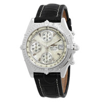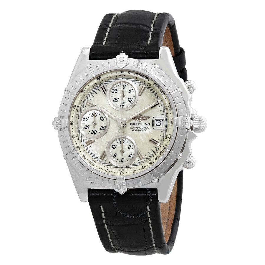 Silver-tone stainless steel case with a black crocodile leather strap. Silver-tone stainless steel bezel. Silver-tone hands and index hour markers. Minute markers around the outer rim. Dial Type: Analog. Luminescent hands and markers. Date display at the 3 o'clock position. Chronograph - three sub-dials displaying: 60 second, 30 minute and 12 hour. Breitling Calibre 13 Automatic movement, based upon ETA Valjoux 7750, containing 25 Jewels, bitting at 28800 vph, and has a power reserve of approximately 42 hours. Scratch resistant sapphire crystal. Solid case back. Round case shape, case size: 40 mm. Tang clasp. Water resistant at 100 meters / 330 feet. Functions: chronograph, date, hour, minute, second, chronometer. Chronomat Series. Luxury watch style. Watch label: Swiss Made. Breitling Chronomat Chronograph Automatic Chronometer Men's Watch J1305012/I350.568P.J18. CASE Case Size: 40 Case Material: Stainless Steel Case Shape: Round Case Back: Solid BAND Band Material: Crocodile Leather Band Type: Strap Band Color: Black Clasp: Tang DIAL Type: Analog Crystal: Scratch Resistant Sapphire Hands: Silver-tone Dial Markers: Index Second Markers: Minute Markers around the outer rim Sub Dials: Three - 60 Second, 30 Minute and 12 Hour Luminiscence: Hands and Markers Bezel Color: Silver-tone Bezel Material: Stainless Steel INFORMATION Brand: Breitling Series: Chronomat Collection Name: Chronomat Gender: Mens Model: J1305012/I350.568P.J18 Watch Label: Swiss Made Movement: Automatic Engine: Breitling Calibre 13 Power Reserve: 42 hours FEATURES Water Resistance: 100 meters / 330 feet Calendar: Date display at the 3 o'clock position Functions: Chronograph, Date, Hour, Minute, Second, Chronometer Watch Features: Analog, Chronometer, Leather, Stainless Steel, Chronograph ADDITIONAL INFO Watch Style: Luxury Warranty: 2 Year Jomashop Warranty Jomashop Sku: BTJ1305012I350568PJ1 Department: Watches Category: Watches