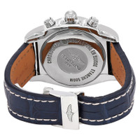 Silver-tone stainless steel case with a blue crocodile leather strap. Uni-directional rotating silver-tone stainless steel bezel. Blue dial with silver-tone hands and index hour markers. Minute markers around the outer rim. Dial Type: Analog. Luminescent hands and markers. Date display between 4 and 5 o'clock position. Chronograph - three sub-dials displaying: 60 second, 60 minute and 12 hour. Breitling Calibre 04 Automatic movement, based upon Breitling Calibre 01, containing 47 Jewels, bitting at 28000 vph, and has a power reserve of approximately 70 hours. Scratch resistant sapphire crystal. Screw down crown. Solid case back. Round case shape, case size: 47 mm. Band width: 24 mm. Deployment with push button release clasp. Water resistant at 500 meters / 1650 feet. Functions: chronograph, date, hour, minute, second, GMT, second time zone, chronometer. Chronomat Gmt Series. Luxury watch style. Watch label: Swiss Made. Breitling Chronomat GMT Chronograph Automatic Chronometer Blue Dial Men's Watch AB041012/BA69.761P.A20D.1. CASE Case Size: 47 Case Material: Stainless Steel Case Shape: Round Case Back: Solid BAND Band Material: Crocodile Leather Band Type: Strap Band Color: Blue Band Width: 24 mm Clasp: Deployment with Push Button Release DIAL Dial Color: Blue Type: Analog Crystal: Scratch Resistant Sapphire Hands: Silver-tone Dial Markers: Index Second Markers: Minute Markers around the outer rim Sub Dials: Three - 60 Second, 60 Minute and 12 Hour Luminiscence: Hands and Markers Bezel: Uni-directional Rotating Bezel Color: Silver-tone Bezel Material: Stainless Steel Crown: Screw Down INFORMATION Brand: Breitling Series: Chronomat Gmt Collection Name: Chronomat GMT Gender: Mens Model: AB041012/BA69.761P.A20D.1 Watch Label: Swiss Made Movement: Automatic Engine: Breitling Calibre 04 Power Reserve: 70 hours FEATURES Water Resistance: 500 meters / 1650 feet Calendar: Date display between 4 and 5 o'clock position Functions: Chronograph, Date, Hour, Minute, Second, GMT, Second Time Zone, Chronometer Watch Features: Analog, GMT, Chronometer, Leather, Stainless Steel, Chronograph, Time Zone ADDITIONAL INFO Watch Style: Luxury Warranty: 1 Year Jomashop Warranty Jomashop Sku: BTAB041012BA69A20D1 Department: Watches Category: Watches