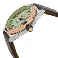 Two-tone (silver-tone and rose gold-tone) stainless steel case with a olive green alligator leather strap. Uni-directional rotating rose gold-tone bezel with diamond set. Mint green dial with rose gold-tone hands and index hour markers. Minute markers around the outer rim. Dial Type: Analog. Luminescent hands and markers. Date display at the 6 o'clock position. Breitling Calibre 10 Automatic movement, based upon ETA 2892-A2, containing 21 Jewels, bitting at 28800 vph, and has a power reserve of approximately 42 hours. Scratch resistant sapphire crystal. Solid case back. Round case shape, case size: 38 mm, case thickness: 11.8 mm. Buckle clasp. Water resistant at 100 meters / 330 feet. Functions: date, hour, minute, second. Chronomat Series. Dress watch style. Watch label: Swiss Made. Breitling Chronomat Super Automatic 38mm Diamond Ladies Watch U17356531L1P1. CASE Case Size: 38 Case Thickness: 11.8 mm Case Material: Stainless Steel Case Shape: Round Case Back: Solid BAND Band Material: Alligator Leather Band Type: Strap Band Color: Olive Green Clasp: Buckle DIAL Dial Color: Mint Green Type: Analog Crystal: Scratch Resistant Sapphire Hands: Rose Gold-tone Dial Markers: Index Second Markers: Minute Markers around the outer rim Luminiscence: Hands and Markers Bezel: Uni-directional Rotating Bezel Color: Rose Gold-tone Bezel Material: Diamond Set INFORMATION Brand: Breitling Series: Chronomat Collection Name: Chronomat Gender: Womens Model: U17356531L1P1 Watch Label: Swiss Made Movement: Automatic Engine: Breitling Calibre 10 Power Reserve: 42 hours FEATURES Water Resistance: 100 meters / 330 feet Calendar: Date display at the 6 o'clock position Functions: Date, Hour, Minute, Second Watch Features: Alligator Leather, Analog, Gold, Leather, Stainless Steel, Diamond ADDITIONAL INFO Watch Style: Dress Warranty: 2 Year Jomashop Warranty Jomashop Sku: BTU17356531L1P1 Department: Watches
