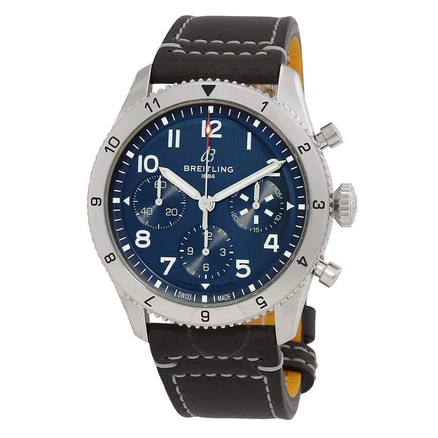 Stainless steel case with a black leather strap. Bi-directional rotating stainless steel bezel. Blue dial with index-Arabic numeral hour markers. Minute markers around the outer rim. Dial Type: Analog. Luminescent hands and markers. Chronograph - three sub-dials displaying: 60 second, 60 minute and 12 hour. Breitling Calibre B23 automatic movement with a 48-hour power reserve. Scratch resistant sapphire crystal. Pull / push crown. Solid case back. Round case shape, case size: 42 mm, case thickness: 14.7 mm. Band width: 22 mm. Deployant buckle clasp. Water resistant at 100 meters / 330 feet. Functions: chronograph, hour, minute, second. Additional Info: original box, international warranty card, manual (complete accessories). Classic Avi Series. Sport watch style. Watch label: Swiss Made. Breitling Classic Avi Chronograph Automatic Blue Dial Men's Watch A233801A1C1X1. CASE Case Size: 42 Case Thickness: 14.7 mm Case Material: Stainless Steel Case Shape: Round Case Back: Solid BAND Band Material: Leather Band Type: Strap Band Color: Black Band Width: 22 mm Clasp: Deployant Buckle DIAL Dial Color: Blue Type: Analog Crystal: Scratch Resistant Sapphire Hands: Silver-tone Dial Markers: Index-Arabic Numeral Second Markers: Minute Markers around the outer rim Sub Dials: Three - 60 Second, 60 Minute and 12 Hour Luminiscence: Hands and Markers Bezel: Bi-directional Rotating Bezel Color: Silver-tone Bezel Material: Stainless Steel Crown: Pull / Push INFORMATION Brand: Breitling Series: Classic Avi Collection Name: Classic Avi Gender: Mens Model: A233801A1C1X1 Watch Label: Swiss Made Movement: Automatic Engine: Breitling Calibre B23 Power Reserve: 48 hours FEATURES Water Resistance: 100 meters / 330 feet Functions: Chronograph, Hour, Minute, Second Watch Features: Analog, Leather, Stainless Steel, Chronograph ADDITIONAL INFO Watch Style: Sport Warranty: 2 Year Jomashop Warranty Additional Info: Original Box, International Warranty Card, Manual (Complete Accessories) Jomashop Sku: BTA233801A1C1X1 Department: Watches Category: Watches