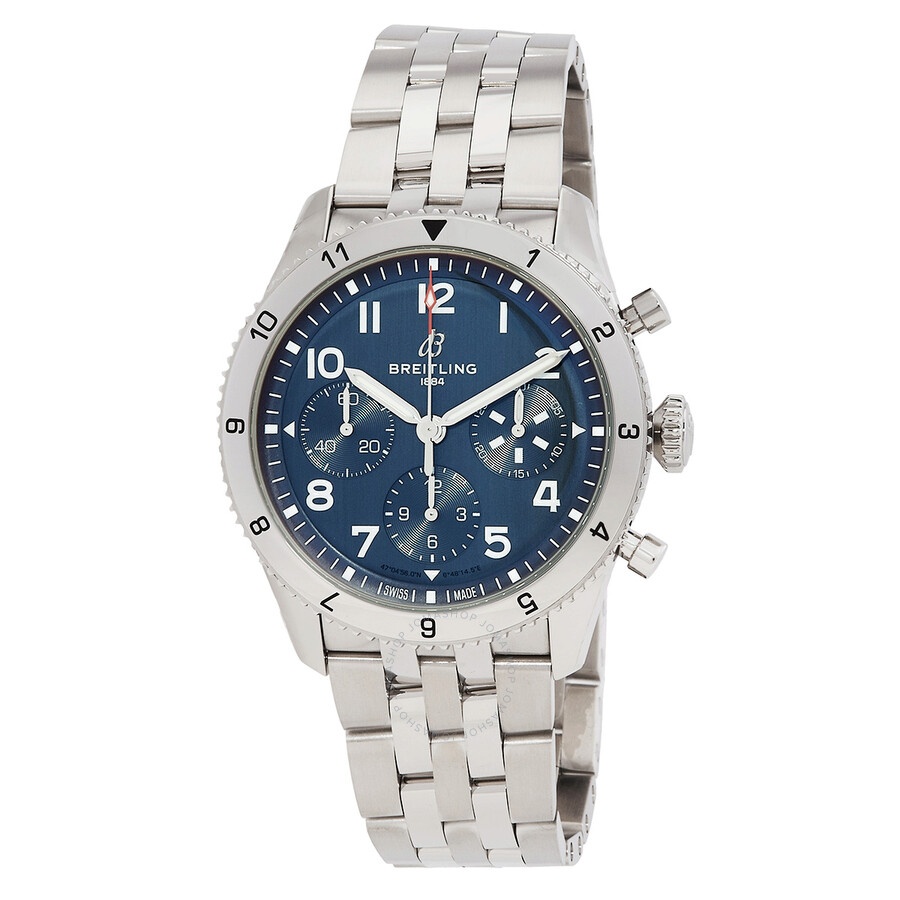 Stainless steel case and bracelet. Bi-directional rotating stainless steel bezel. Blue dial with index-Arabic numeral hour markers. Minute markers around the outer rim. Dial Type: Analog. Luminescent hands and markers. Chronograph - three sub-dials displaying: 60 second, 60 minute and 12 hour. Breitling Calibre B23 automatic movement with a 48-hour power reserve. Scratch resistant sapphire crystal. Pull / push crown. Solid case back. Round case shape, case size: 42 mm, case thickness: 14.7 mm. Band width: 22 mm. Deployant buckle clasp. Water resistant at 100 meters / 330 feet. Functions: chronograph, hour, minute, second. Additional Info: original box, international warranty card, manual (complete accessories). Classic Avi Series. Sport watch style. Watch label: Swiss Made. Breitling ClASSIC AVI 42 Chronograph Automatic Blue Dial Men's Watch A233801A1C1A1. CASE Case Size: 42 Case Thickness: 14.7 mm Case Material: Stainless Steel Case Shape: Round Case Back: Solid BAND Band Material: Stainless Steel Band Type: Bracelet Band Color: Silver-tone Band Width: 22 mm Clasp: Deployant Buckle DIAL Dial Color: Blue Type: Analog Crystal: Scratch Resistant Sapphire Hands: Silver-tone Dial Markers: Index-Arabic Numeral Second Markers: Minute Markers around the outer rim Sub Dials: Three - 60 Second, 60 Minute and 12 Hour Luminiscence: Hands and Markers Bezel: Bi-directional Rotating Bezel Color: Silver-tone Bezel Material: Stainless Steel Crown: Pull / Push INFORMATION Brand: Breitling Series: Classic Avi Collection Name: ClASSIC AVI Gender: Mens Model: A233801A1C1A1 Watch Label: Swiss Made Movement: Automatic Engine: Breitling Calibre B23 Power Reserve: 48 hours FEATURES Water Resistance: 100 meters / 330 feet Functions: Chronograph, Hour, Minute, Second Watch Features: Analog, Stainless Steel, Chronograph ADDITIONAL INFO Watch Style: Sport Warranty: 2 Year Jomashop Warranty Additional Info: Original Box, International Warranty Card, Manual (Complete Accessories) Jomashop Sku: BTA233801A1C1A1 Department: Watches Category: Watches