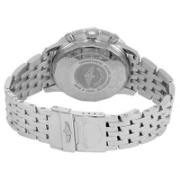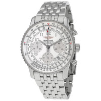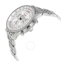 Silver-tone stainless steel case with a stainless steel bracelet. Bi-directional rotating slide rule silver-tone stainless steel bezel. Silver dial with black hands and Arabic numerals on a GMT scale hour markers, minute markers around the outer rim hour markers. Dial Type: Analog. Luminescent hands and dial markers. Date display between 4 and 5 o'clock position. Chronograph - three sub-dials displaying: 60 second, 30 minute and 12 hour. Breitling Calibre 22 Automatic movement, based upon ETA 2892-A2, containing 21 Jewels, bitting at 28800 vph, and has a power reserve of approximately 42 hours. Scratch resistant sapphire crystal. Screw down crown. Solid case back. Round case shape, case size: 41.5 mm, case thickness: 14.4 mm. Band width: 22-20 mm, band length: 8.5 inches. Deployment clasp. Water resistant at 30 meters / 100 feet. Functions: chronograph, GMT, second time zone, date, hour, minute, second, chronometer. Additional Info: power reserve: 42 hours / jewels: 38 jewels / vibration: 28 800 v.p.r. / caliber: breiting 22. Cosmonaute Series. Sport watch style. Breitling Cosmonaute Chronograph Automatic Chronometer Silver Dial Men's Watch A2232212/G517.423A. CASE Case Size: 41 Case Thickness: 14.4 mm Case Material: Stainless Steel Case Shape: Round Case Back: Solid BAND Band Material: Stainless Steel Band Type: Bracelet Band Length: 8.5 inches Band Width: 22-20 mm Clasp: Deployment DIAL Dial Color: Silver Type: Analog Crystal: Scratch Resistant Sapphire Hands: Black Dial Markers: Arabic Numerals on a GMT Scale Hour Markers, Minute Markers around the outer rim Sub Dials: Three - 60 second, 30 Minute and 12 Hour Luminiscence: Hands and Dial Markers Bezel: Bi-directional Rotating Slide Rule Bezel Color: Silver-tone Bezel Material: Stainless Steel Crown: Screw Down INFORMATION Brand: Breitling Series: Cosmonaute Collection Name: Cosmonaute Gender: Mens Model: A2232212/G517.423A Movement: Automatic Engine: Breitling Calibre 22 Power Reserve: 42 hours FEATURES Water Resistance: 30 meters / 100 feet Calendar: Date display between 4 and 5 o'clock position Functions: Chronograph, GMT, Second Time Zone, Date, Hour, Minute, Second, Chronometer Watch Features: Analog, Time Zone, Chronograph, Stainless Steel, GMT, Chronometer ADDITIONAL INFO Watch Style: Sport Warranty: 2 Year Jomashop Warranty Additional Info: Power Reserve: 42 hours / Jewels: 38 Jewels / Vibration: 28 800 v.p.r. / Caliber: Breiting 22 Jomashop Sku: BTA2232212G517423A Department: Watches Category: Watches